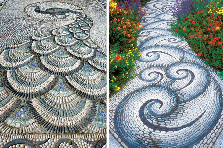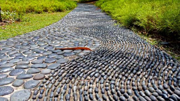 Những viên đá cuội màu xám và xanh xếp lại với nhau 1 cách hợp lý tạo thành con đường đi bộ tuyệt với, đi bộ trên đá cuội là một biện pháp massage tuyệt vời.