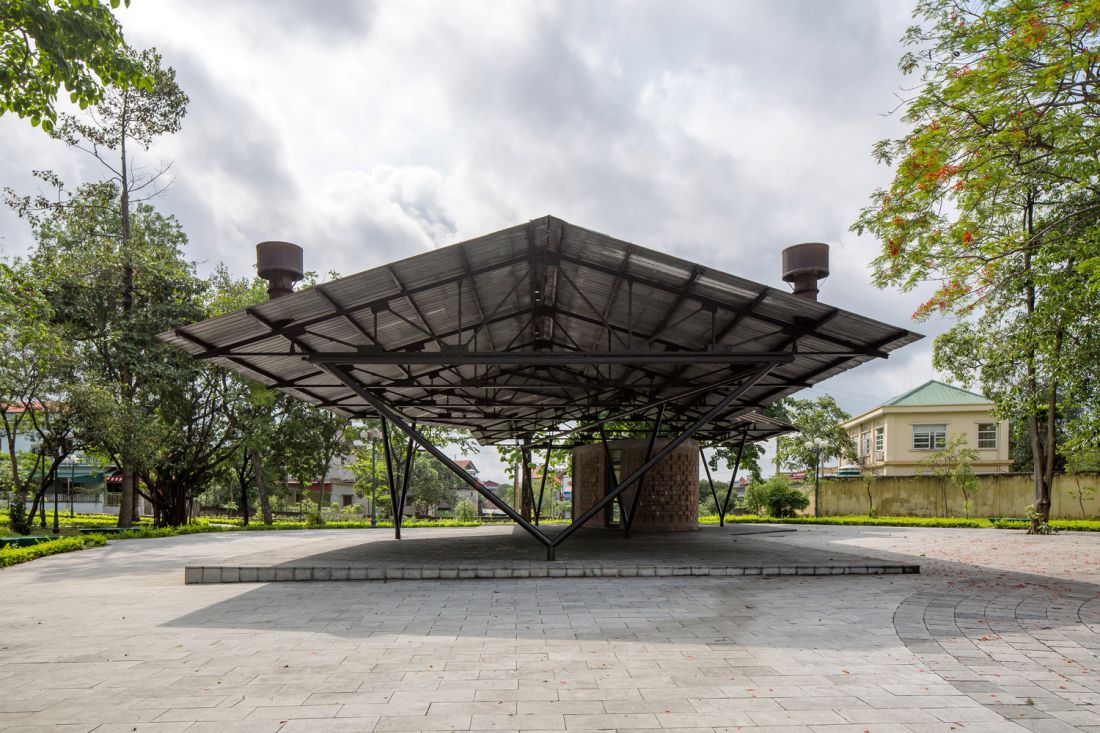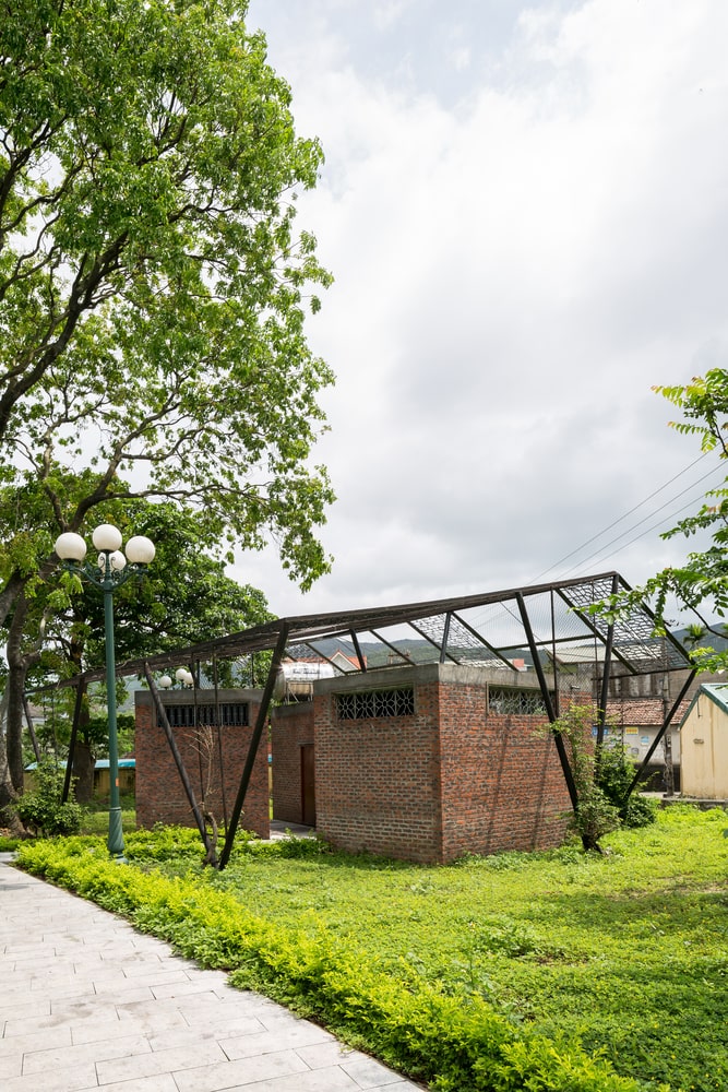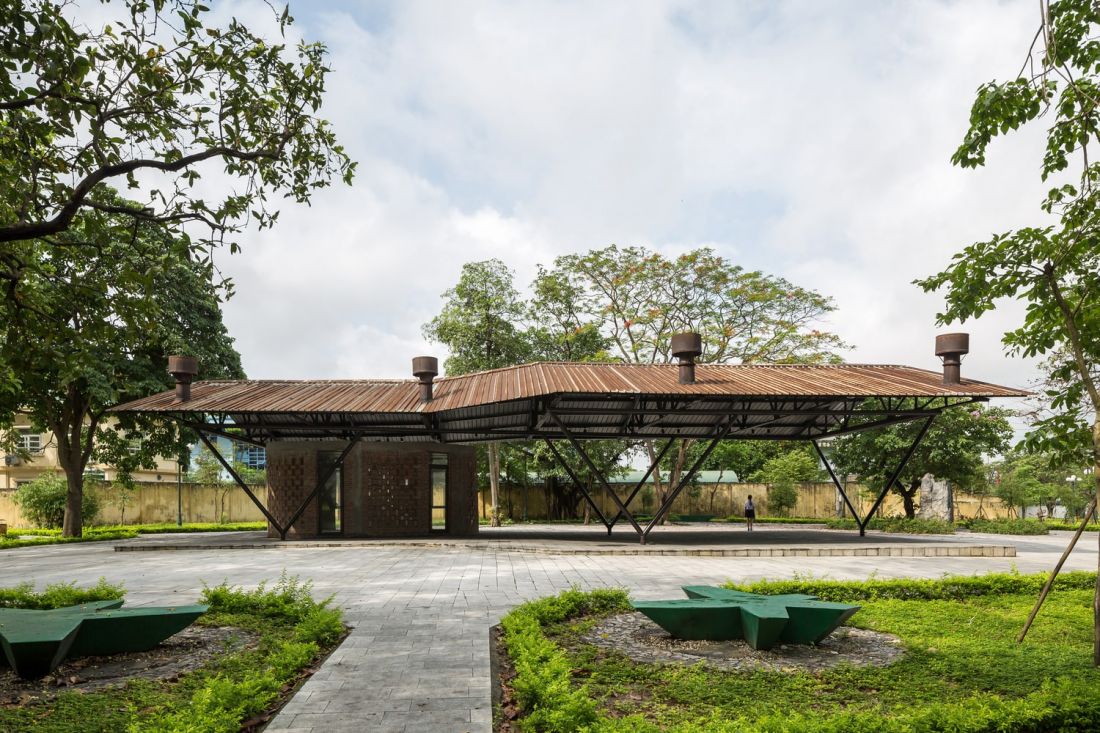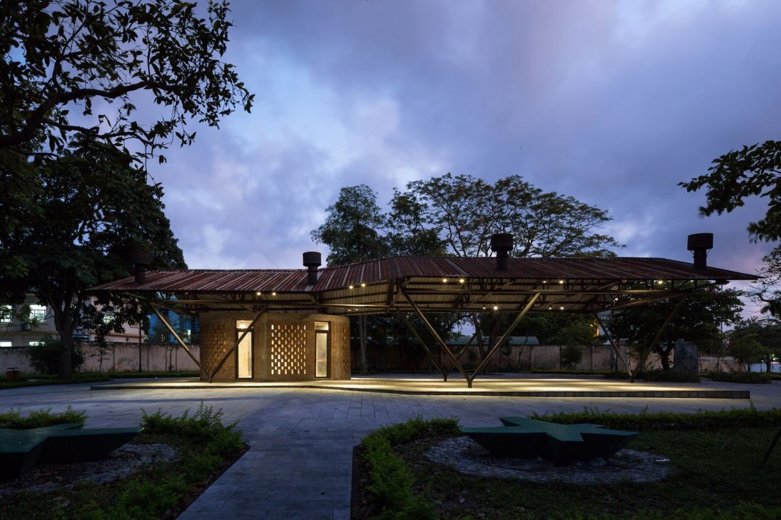 Khu vực vệ sinh công cộng giống như ba khối điêu khắc ẩn mình dưới bóng cây xanh và hệ thống khung bằng ống thép cũ. Ba khối này có kích thước khác nhau và bố trí ngẫu nhiên sao cho có thể che khuất tầm nhìn từ ngoài vào mà không cần dùng thêm phương án che chắn khác nhưng vẫn đảm bảo riêng tư cần thiết và hài hòa với cảnh quan công cộng.