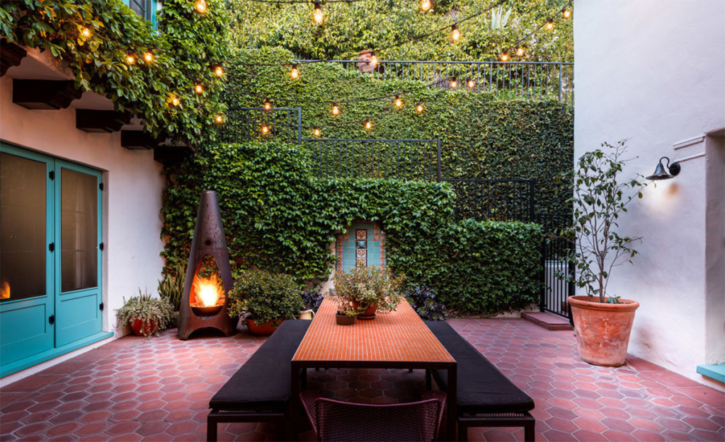 Bên ngoài, có một sân thượng tích hợp thêm khu ăn uống được lát gạch và trang trí thêm đèn dây lấp lánh.