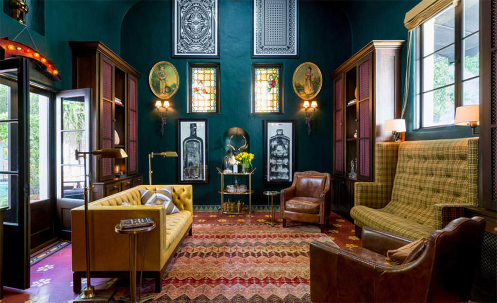 Phòng khách nổi bật với bộ ghế sofa họa tiết độc đáo, trang trí thêm cây xanh và luôn có ánh sáng tự nhiên qua cửa sổ kính vòm đặc trưng, ở giữa là lò sưởi lớn.