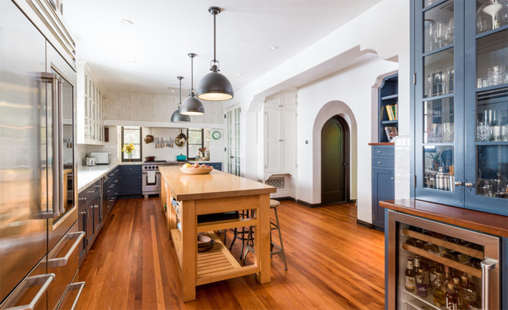 Nhà bếp nhẹ nhàng và tươi sáng hơn với những bức tường trắng rõ nét, đầy đủ trang thiết bị không gỉ và có tủ lưu trữ màu xanh dương.