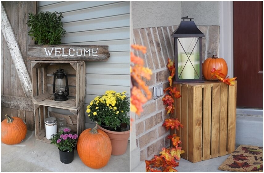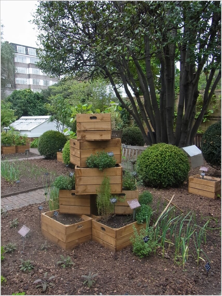 Những thùng gỗ được tận dụng để trồng cây và trang trí trong vườn.