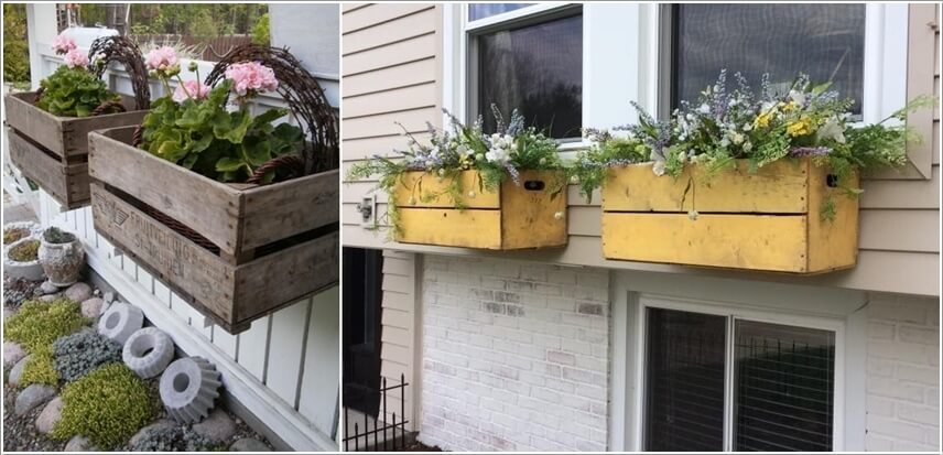 Sử dụng thùng gỗ thay thế cho chậu cây để trồng hoa trang trí bên ngoài cửa sổ.