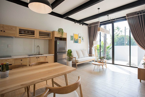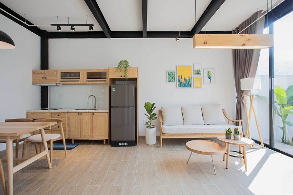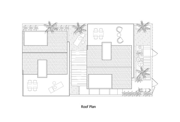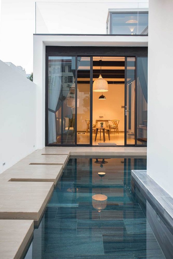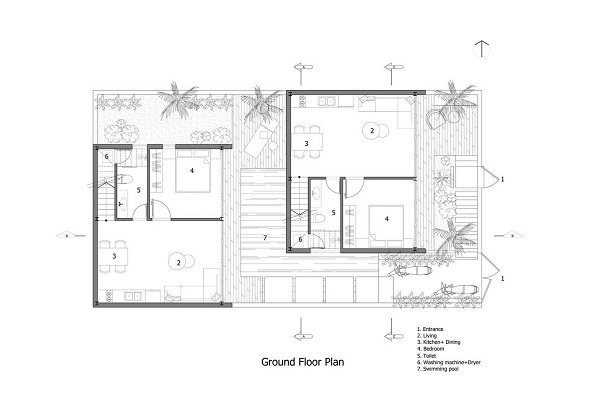 Qua đó giải pháp của kiến trúc sư đề xuất xây hai ngôi nhà nhỏ riêng biệt trên cùng mảnh đất. Một ngôi nhà là để ở khi vợ chồng trở lại Việt Nam và một để cho thuê khoảng 2.000 USD/tháng. Chủ nhà đã đồng ý ngay với đề xuất trên và nghĩ rằng đó cũng là một giải pháp phù hợp đồng thời tạo ra một khoảng thu nhập nhỏ. Từ đó phương án mặt bằng chi tiết của ngôi nhà đã được thiết kế, trong đó mảnh đất chia thành 2 phần, một là ở phía trước và một ở phía sau. Phần phía trước là ngôi nhà cho thuê có 2 phòng ngủ, phòng khách, bếp và đầy đủ tiện nghi, Phần phía sau là ngôi nhà đây cũng chính là nơi gia chủ sẽ sử dụng mỗi khi trở về Việt Nam. Bên cạnh những tiện nghi tối thiểu theo phong cách tối giản, thì ngôi nhà này còn có một hồ bơi nhỏ để thư giãn.