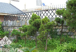 Bức tường xếp đá bài trí cùng nhiều loại cây xanh.