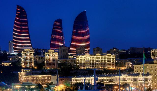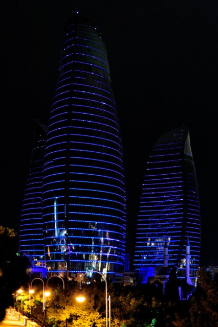 Các tháp lửa Baku nổi bật cao trung bình khoảng 190m, nằm giữa đường chân trời của các tòa nhà cao tầng lịch sử.