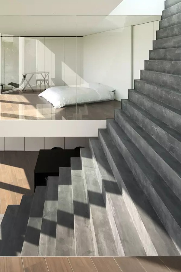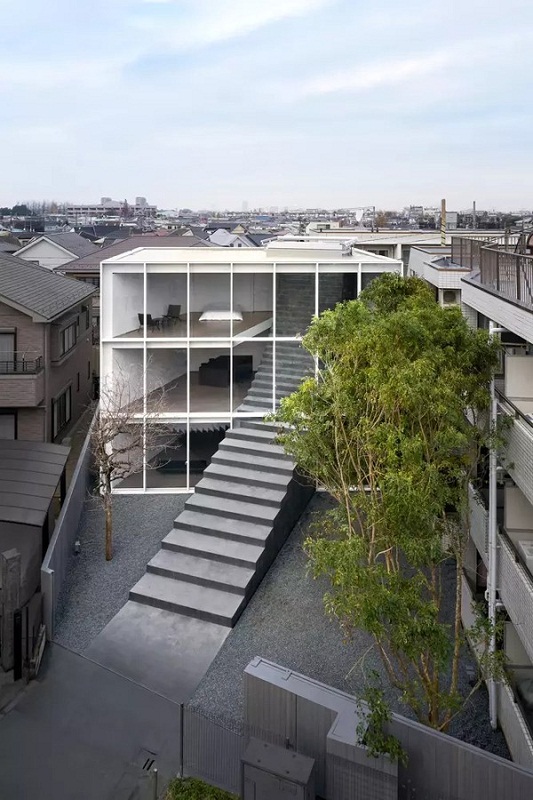 Ngôi nhà được xây dựng ở thành phố Mitano, Nhật Bản với tổng diện tích là 284m2. Điểm ấn tượng và đặc biệt nhất của ngôi nhà chính là cầu thang lớn bắt đầu từ cổng xuyên vào trong. Ngôi nhà được thiết kế lùi lại phía sau để một không gian lớn phía trước sân với mục đích tạo nên điểm nhấn cũng như sự thông thoáng khi nhìn vào.