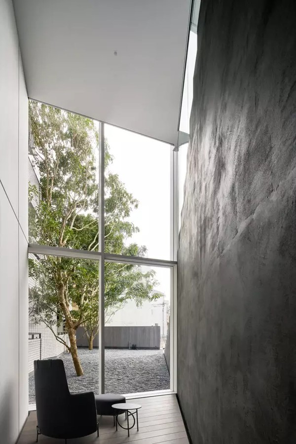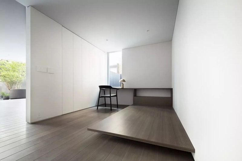 Phòng ngủ với nội thất tối giản mà lại vô cùng hiện đại với một góc phòng ngủ khi nhìn ra khoảng sân thông thoáng phía trước.