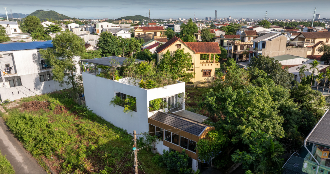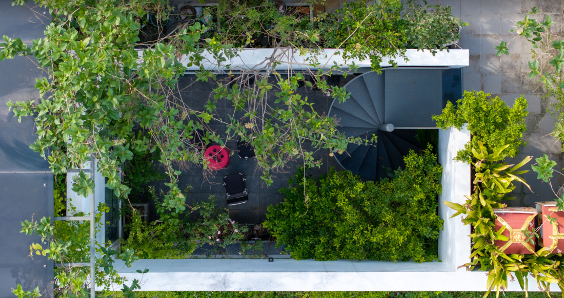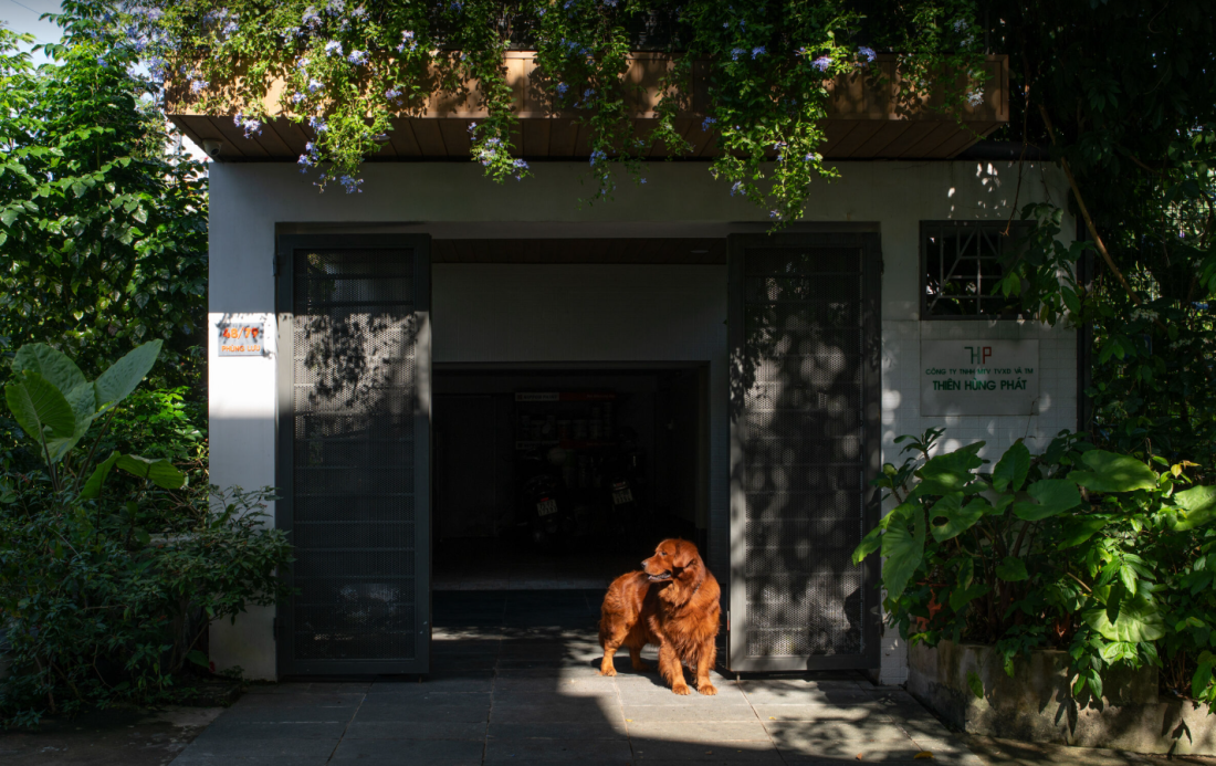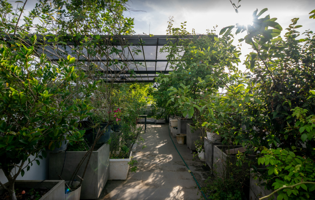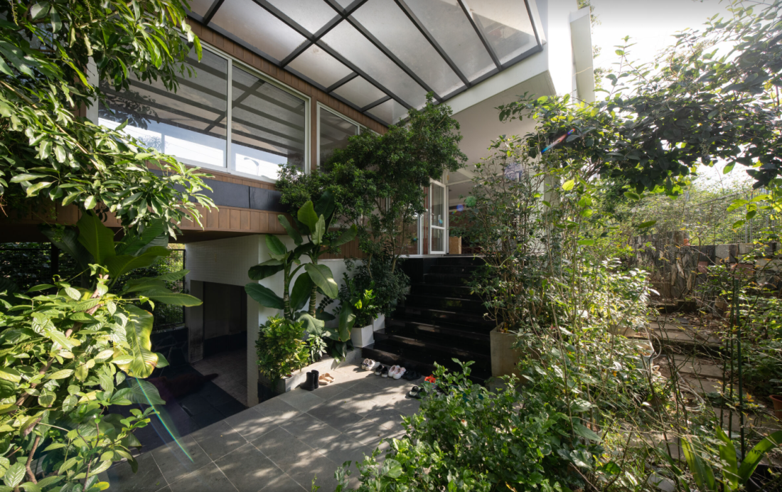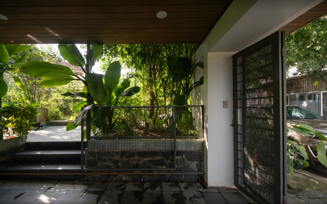 Để thích nghi, ngôi nhà được bao quanh bởi khu vườn rộng lớn, chiếm đến 90% diện tích. Trước nhà, bên hông, sau lưng, và cả trên mái đều rợp bóng cây xanh. Những hàng cây không chỉ làm không gian mát mẻ mà còn giảm nhiệt độ, như một lá chắn tự nhiên. Khi bước vào nhà, cảm giác dễ chịu như đang nghỉ ngơi trong một khu rừng nhỏ.