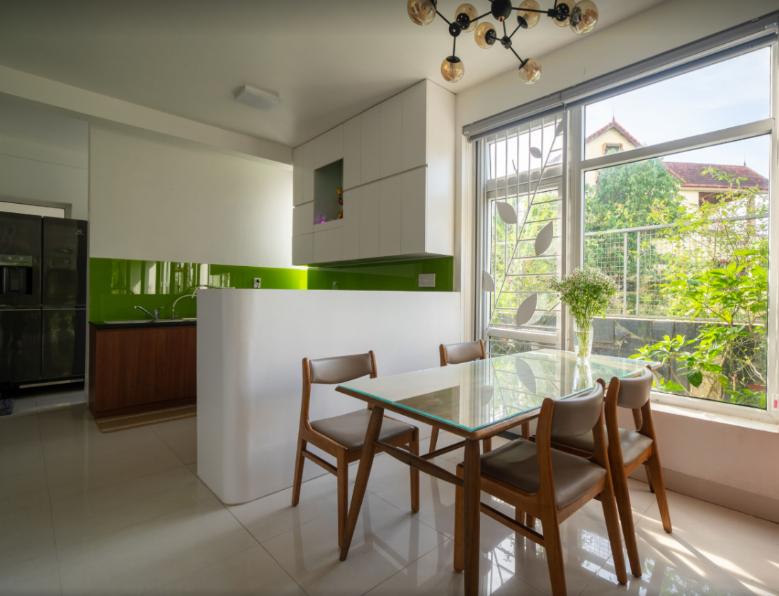 Cũng tại tầng này, nhà bếp thiết kế mở, nối liền với phòng khách và khu ăn uống. Gió từ cửa sổ lớn thổi qua, mang theo hương vị thiên nhiên.