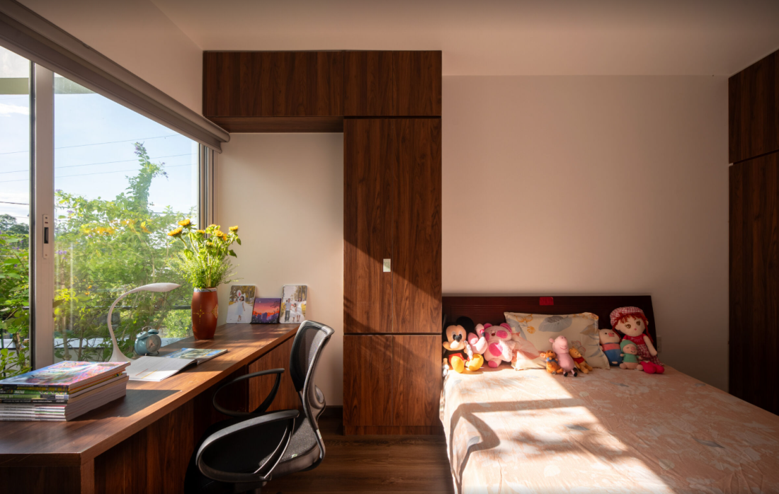 Lê đến tầng 2, các phòng ngủ nằm ở góc yên tĩnh có cửa sổ kính bản lớn hướng ra khu vườn xanh.