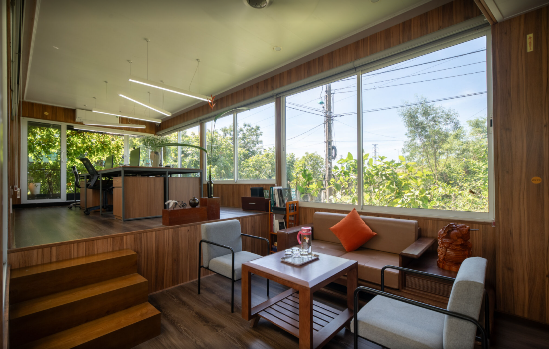 Bước vào phòng khách tầng lửng, bạn sẽ bị ấn tượng bởi sự rộng rãi và nâng bậc, Phía trước là không gian làm việc văn phòng thiết kế sàn gỗ giật cấp, phía sau là không gian dành cho phòng khách.