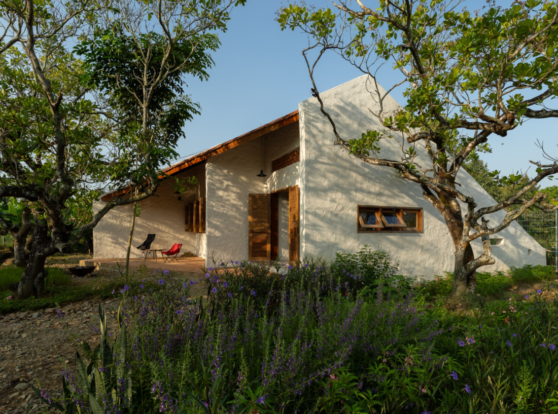 Ngôi nhà dần hiện hình với mái nghiêng độc đáo, tường cao thấp linh hoạt, hiên phía đông nhô lên đón ánh bình minh và hiên phía tây thấp xuống, nép dưới bóng cây để tránh cái nóng buổi chiều.
