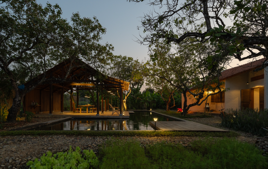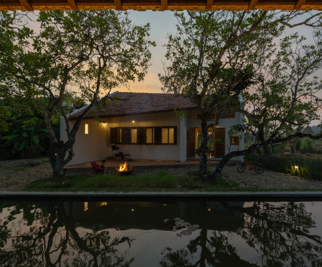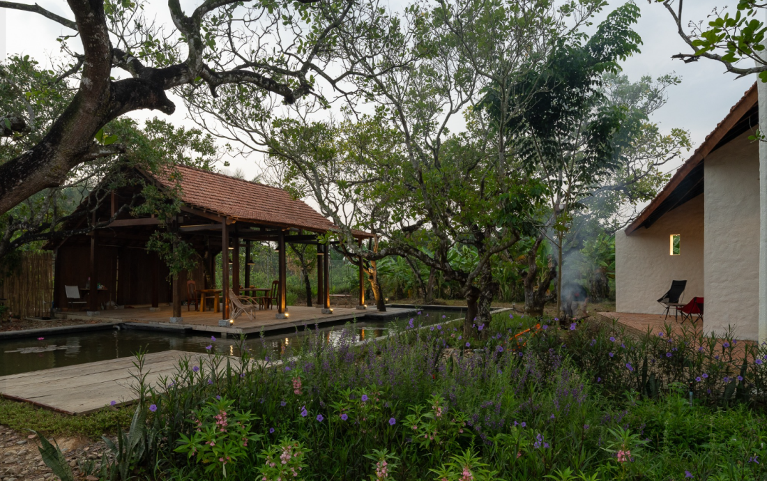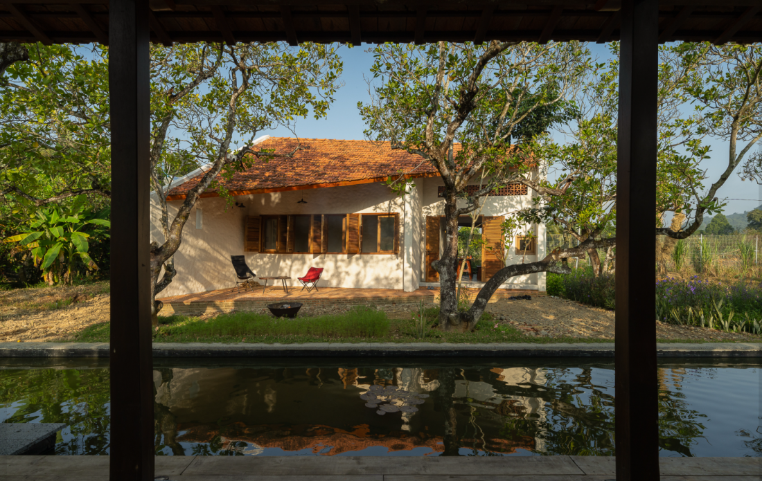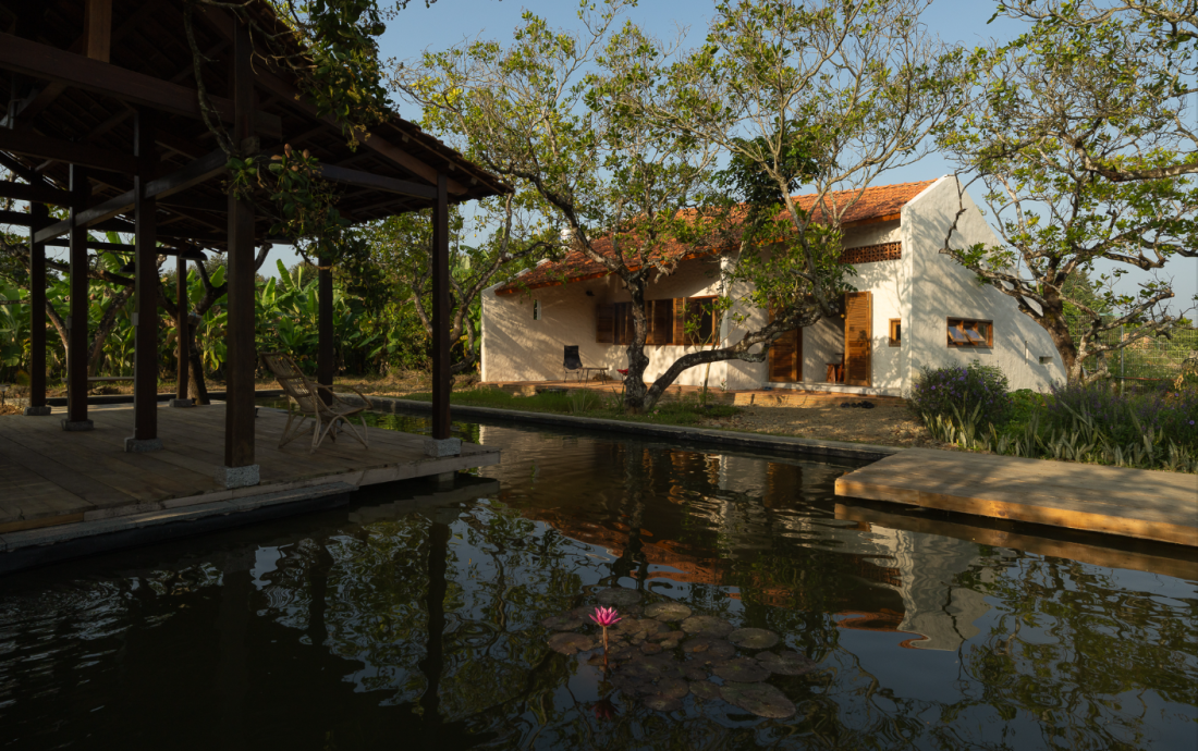 Giữa nhà, một cái ao nhỏ không chỉ làm mát không gian mà còn phản chiếu cây xanh, nối liền các khu vực sinh hoạt. Trong tương lai, một khối homestay quanh ao sẽ hoàn thiện bức tranh này.