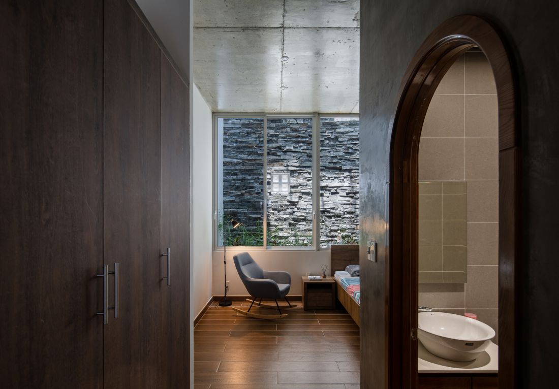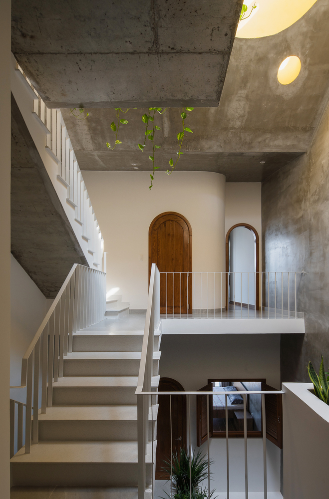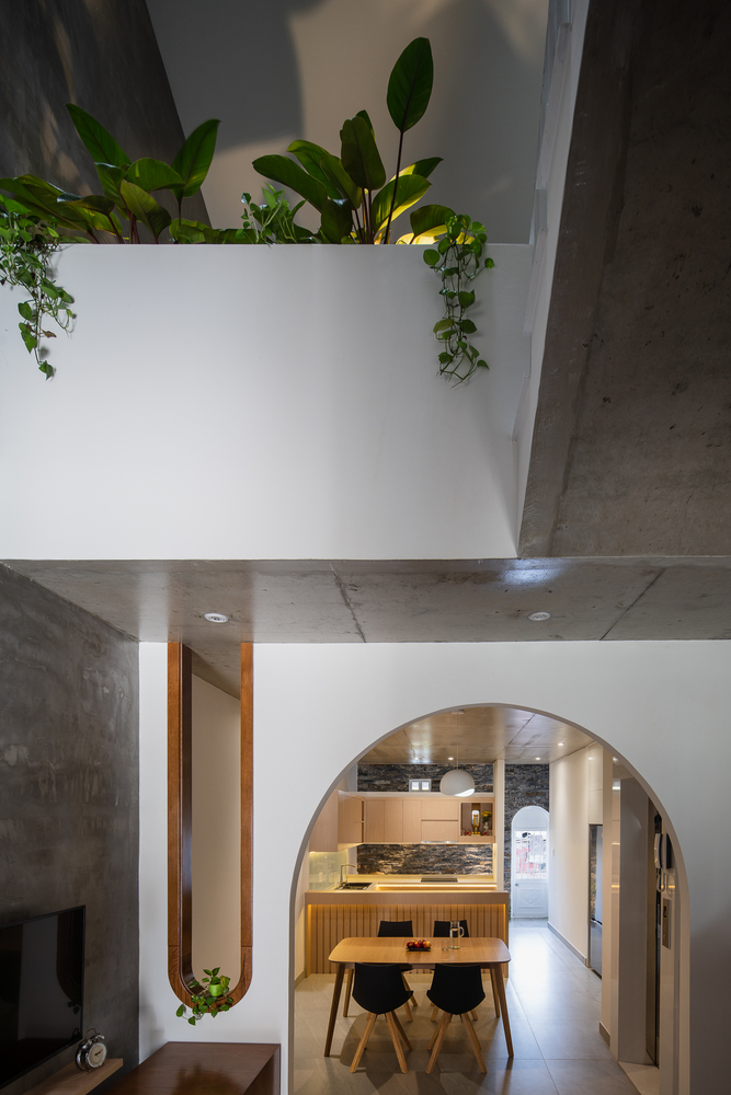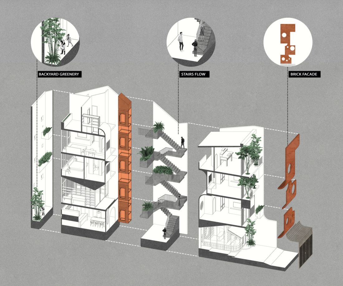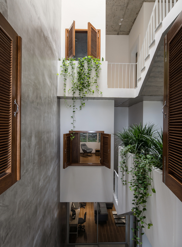 Ngôi nhà nằm ở phía Tây, nên kiến trúc sư đã sử dụng giải pháp tạo nhiều khoảng trống giúp giảm thiểu tiếng ồn bên ngoài, bụi và ánh nắng trực tiếp vào. Hơn nữa những khoảng trống này còn mang đến bầu không khí trong lành; Cây xanh, ánh sáng kết hợp với nhau cũng mang đến yếu tố thiên nhiên cần thiết cho kiểu nhà ống với khí hậu khắc nghiệt ở khu vực Miền Trung Việt Nam.