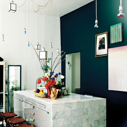 Tại căn bếp này, đen và trắng được kết hợp tạo sự cân bằng. Bảng màu tối giản và bức tường trắng, kết hợp đồ nội thất nhà bếp thông minh, hiện đại. Thêm một bình hoa đủ sắc, các loại đèn treo hài hòa với kết cấu có sẵn.