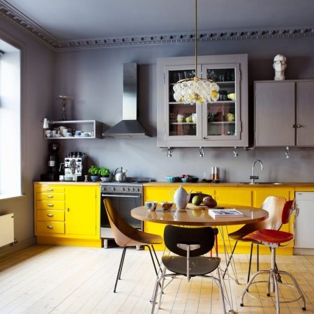 Tạo nổi bật với màu vàng trên tông màu xám chủ đạo. Dùng sắc vàng đậm nơi kệ tủ, bồn rửa, bàn ăn để tạo sự tươi sáng, vui vẻ nhưng cũng đầy tinh tế.