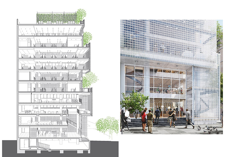 Tòa nhà được hình thành từ các khối hộp xếp chồng lên nhau và bao bọc xung quanh bằng nhiều lớp kính cường lực vững chắc, phần sân thượng ở giữa để trồng cây xanh. Mặt tiền của tòa nhà văn phòng có chức năng như bộ lọc để tối ưu hóa điều kiện vi khí hậu và ánh sáng.