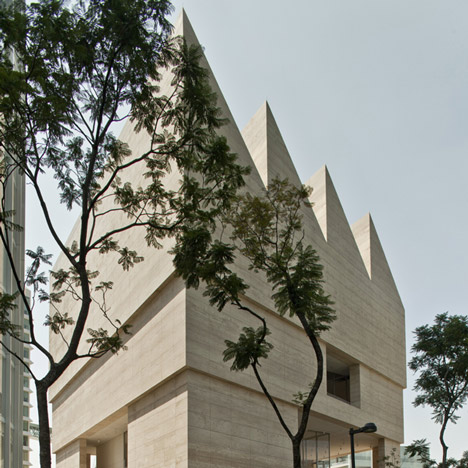 Với thiết kế răng cưa đặc sắc, công trình được phủ bằng đá travertine khai thác tại địa phương.