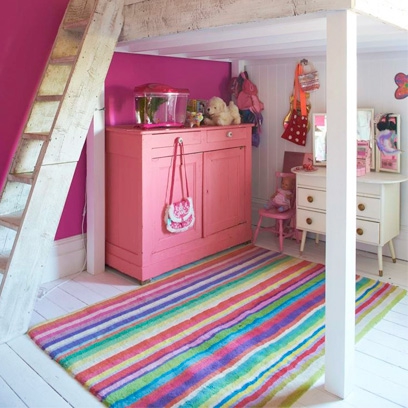 Tủ hồng, tường hồng, trải thảm đầy màu sắc cùng các vật dụng nổi bật trong góc phòng.