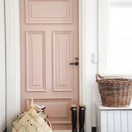 Cánh cửa màu hồng nổi bật trên bức tường màu trắng.