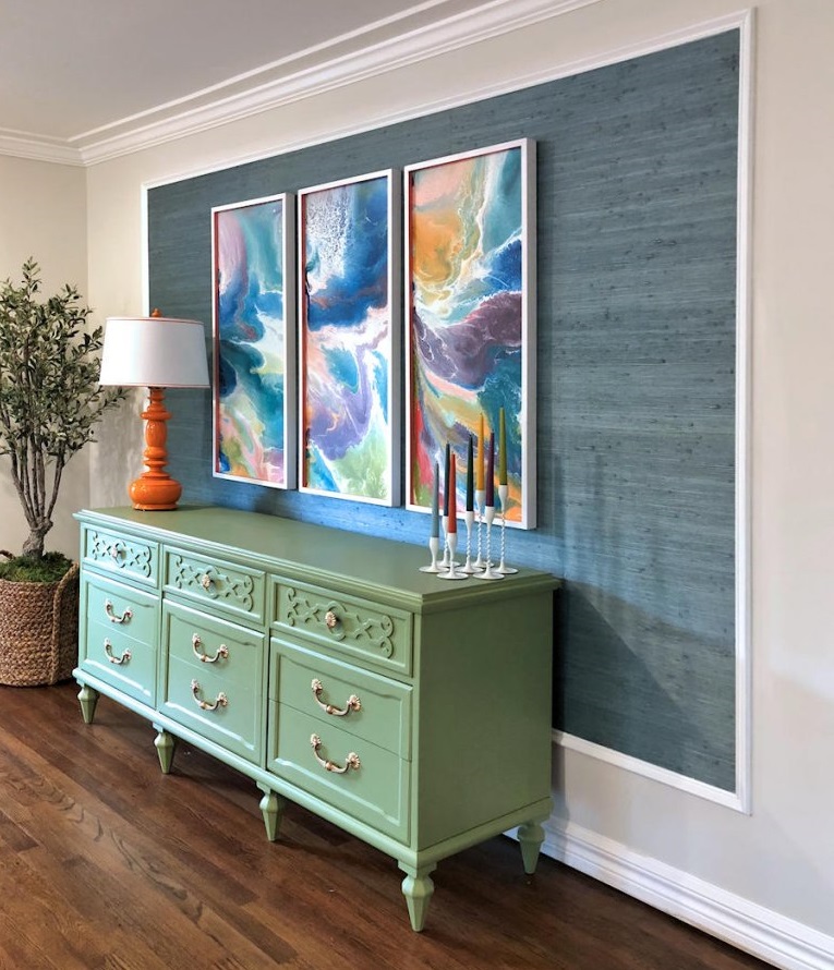 Đóng khung một mảnh lớn hình nền, trên đó bạn có thể đặt những bức tranh sáng tạo trang trí, tạo không gian nghệ thuật cho khu vực lối vào.