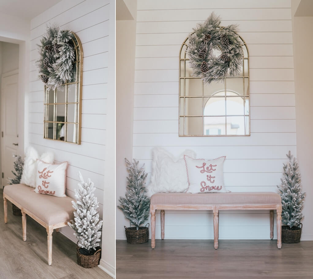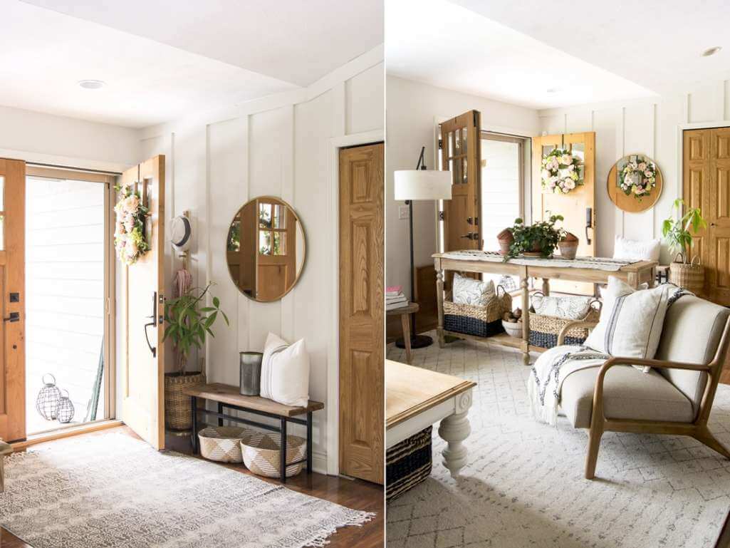 Bạn có thể sử dụng gỗ và sơn màu trắng trang trí cho bức tường ngay phía sau cánh cửa tạo cảm giác thanh lịch, mộc mạc.