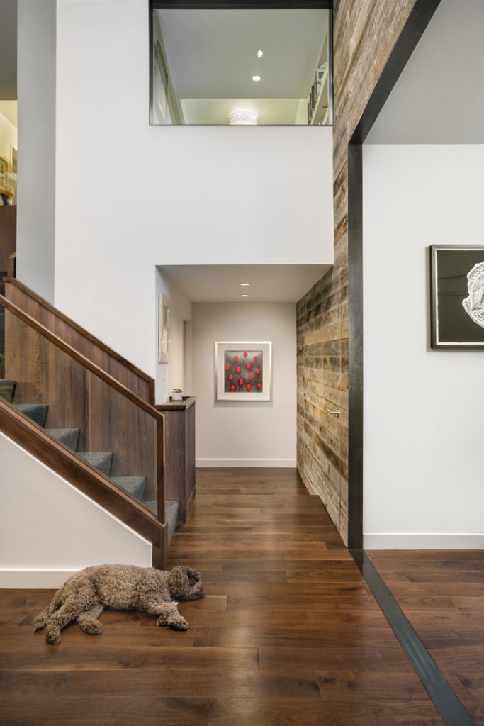 Để tạo cảm giác mộc mạc trong lối vào hiện đại bạn có thể trang trí bức tường với gỗ tái chế.