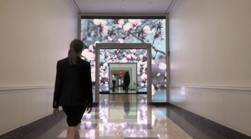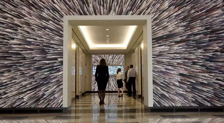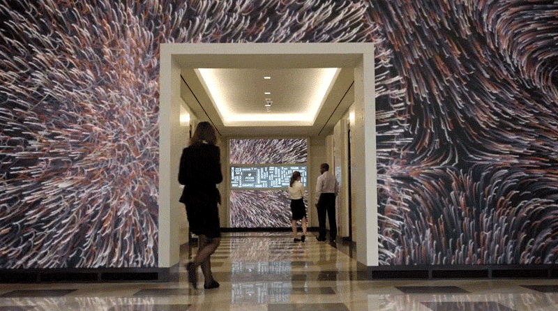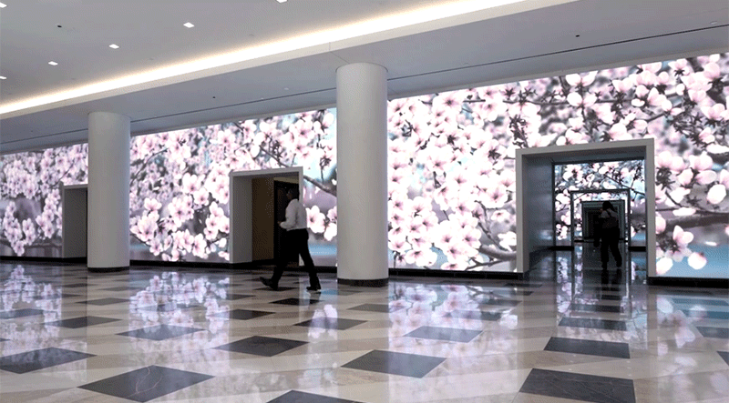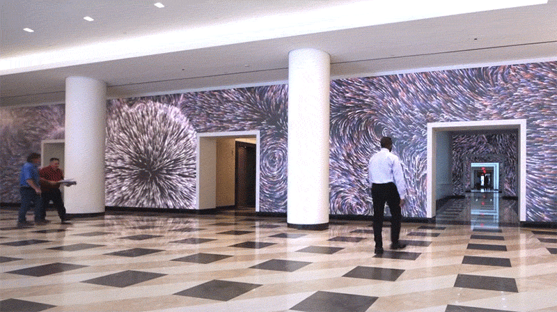 Tất cả được áp vào tường một cách tinh tế, độc đáo, không hề cứng nhắc từ những dấu lắp đặt công nghệ để lại. Những màn hình điện tử ốp tường này hoạt động như một bức tranh tường, tổng diện tích tầm cỡ 157 mét vuông.