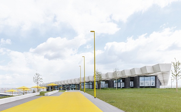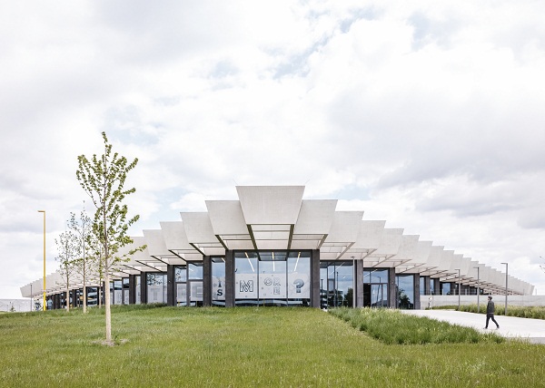 Mái nhà hình thoi khổng lồ bao phủ toàn bộ tòa nhà như một tấm thảm lưới khổng lồ, bắt mắt.