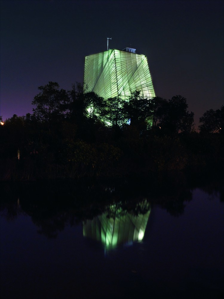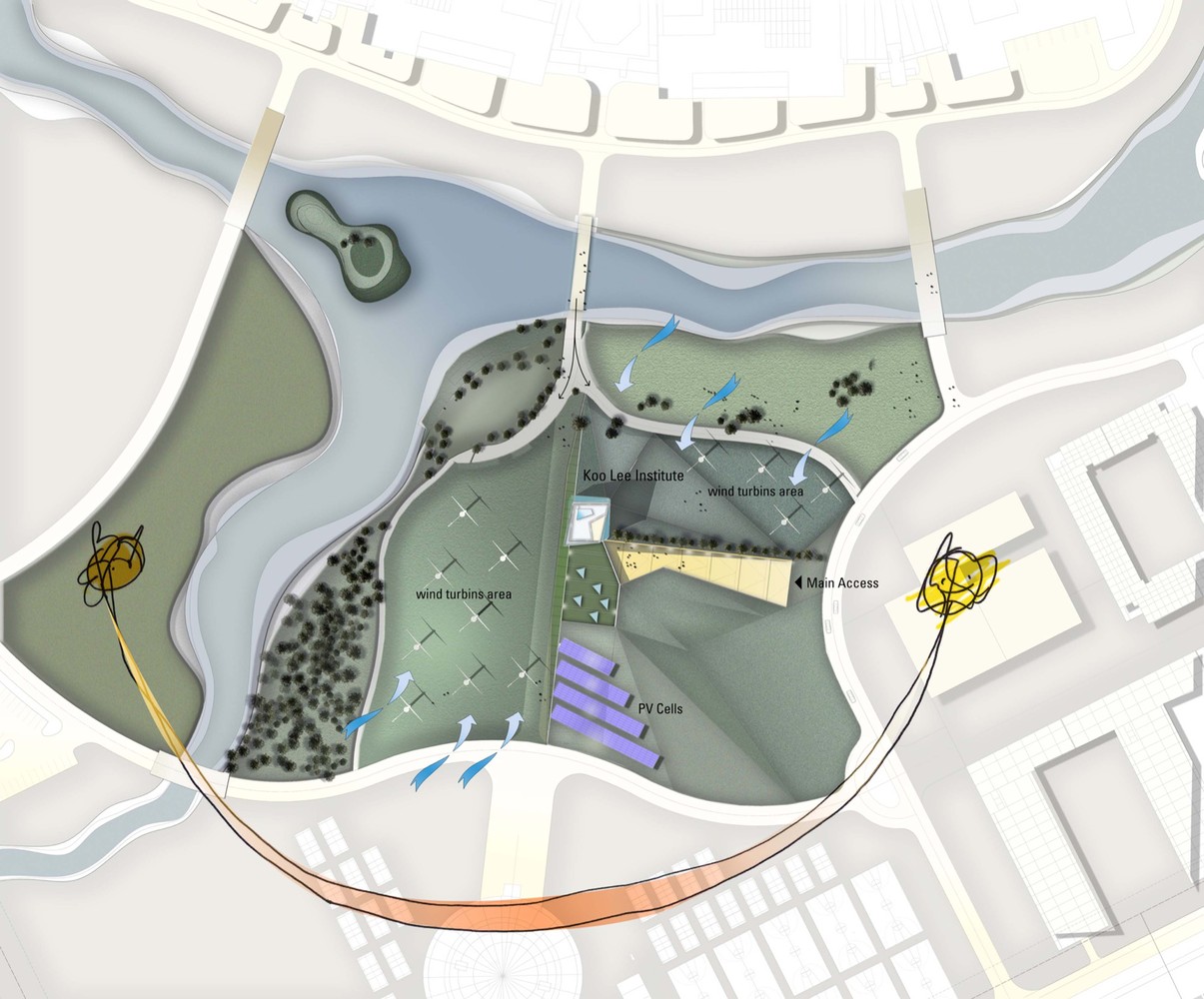 Dự án này nằm ngay một khu vực bãi cỏ dọc theo con suối chảy qua khuôn viên và có thiết kế lấy cảm hứng từ những chiếc đèn lồng giấy hình quạt có trong văn hóa truyền thống Trung Quốc.
