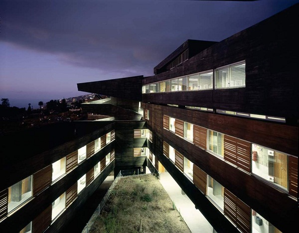 Mặt ngoài của tòa nhà đa giác làm bằng chất liệu bê tông có các màu khác nhau.