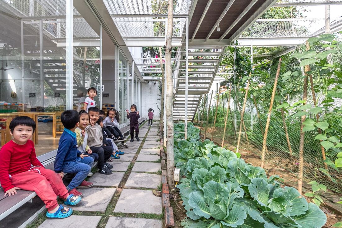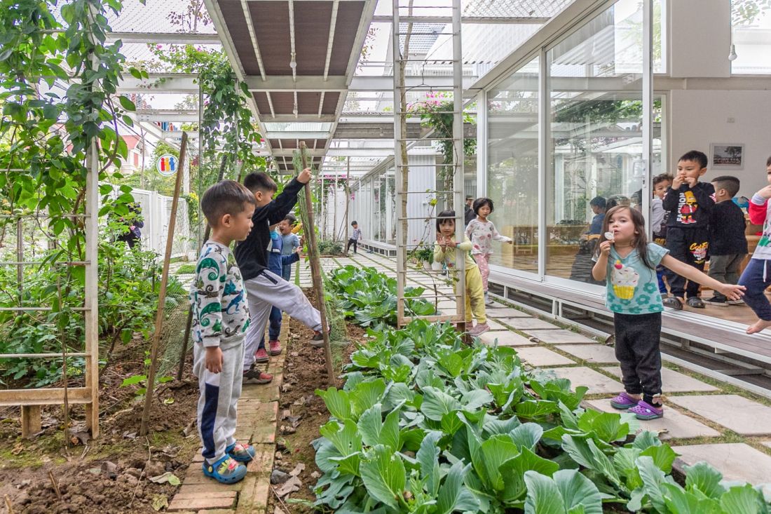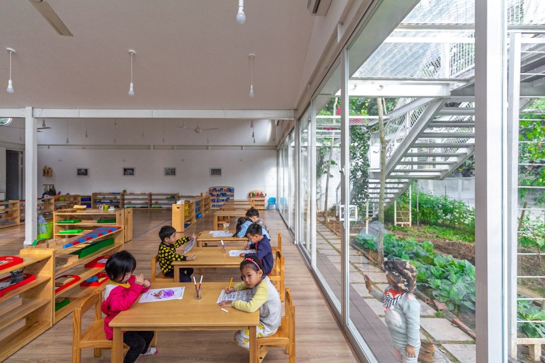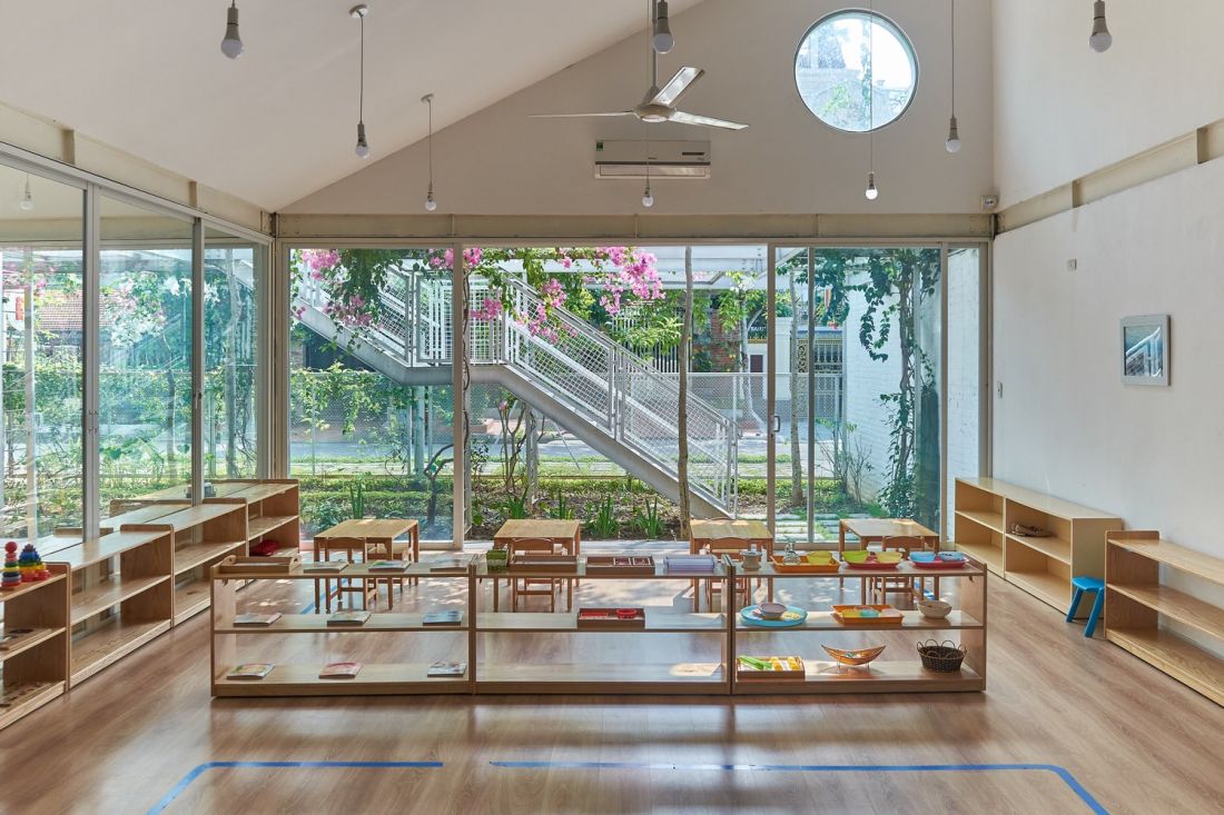 Ngôi trường mầm non được phát triển và định hướng theo phương pháp Montessori, vì vậy chủ đầu tư và kiến trúc sư mong muốn tạo dựng một khu vườn như không gian thiên nhiên cho trẻ - một lớp học giữa cỏ cây hoa lá.