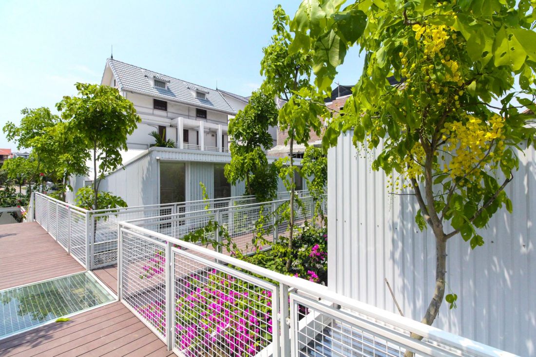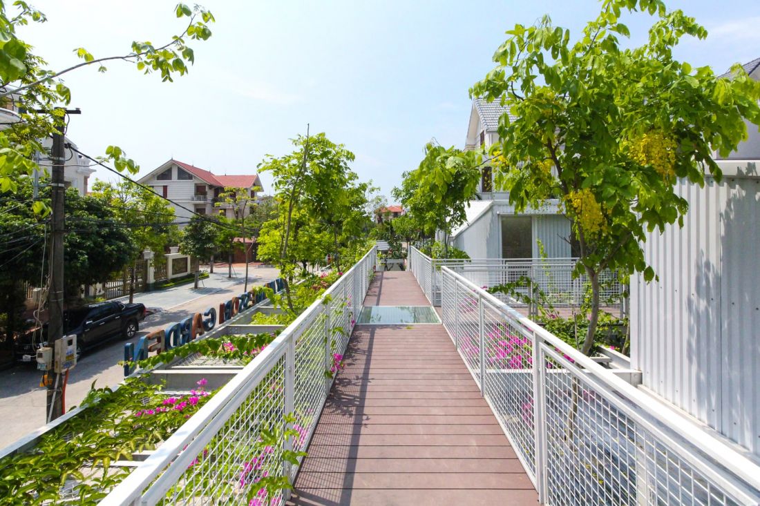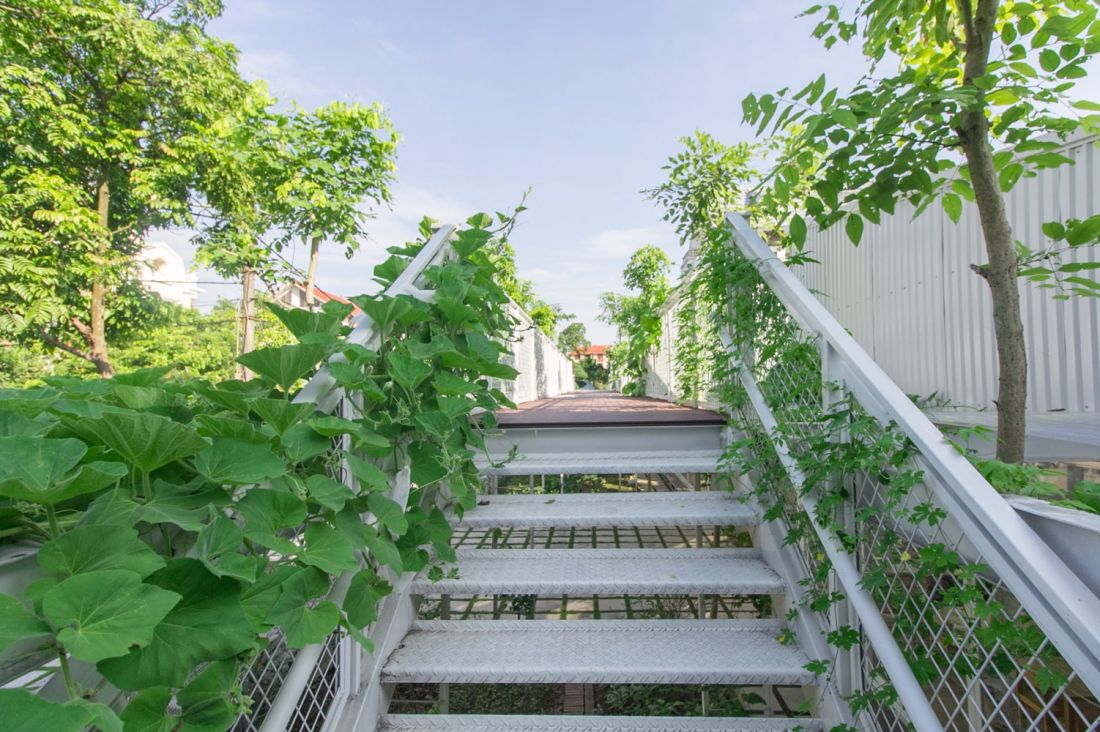Cụ thể, kết cấu thép 2 khối lớp khung thép, có sân vườn bao quanh. Bên ngoài hai dãy nhà là hệ giàn leo bằng khung thép và lưới thép nên sẽ có hai khu vườn. Một khu trồng cây to dưới đất và một khu trồng cây ăn quả phía trên, cả hai được nối với nhau bằng hệ thống 3 cầu thang sắt và lối đi trên cao tạo thành một hệ thống liên hoàn xuyên suốt trong vườn.