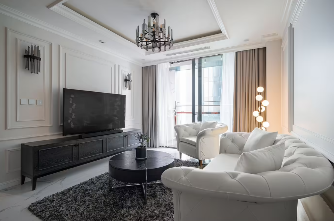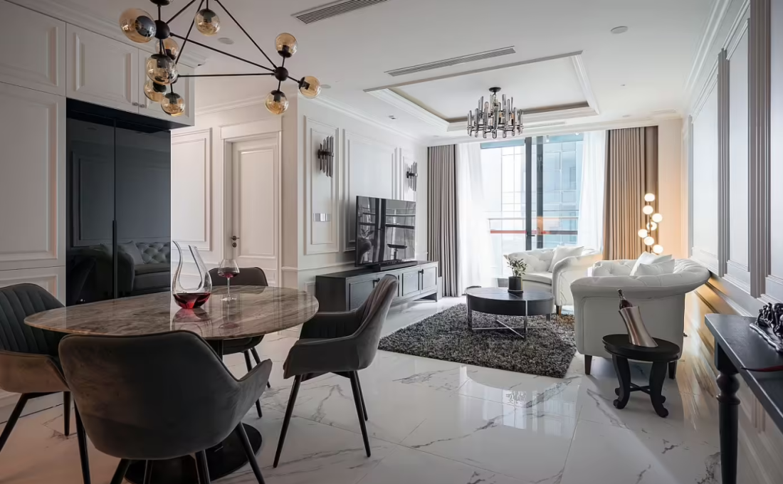 Tổng quan về căn hộ: Căn hộ cũ có cấu trúc bị chia cắt, gây cản trở ánh sáng và sự liên kết không gian. Giải pháp cải tạo đã tập trung vào việc tạo ra một không gian rộng rãi, liền mạch và thể hiện nét đặc trưng của phong cách Tân Cổ Điển. Các bức tường ngăn cách không cần thiết đã được dỡ bỏ để tạo ra một không gian sinh hoạt chung mở lớn, nơi phòng khách và phòng ăn hòa quyện vào nhau. Sự liền mạch này giúp ánh sáng tự nhiên từ cửa sổ lớn lan tỏa khắp căn hộ, đồng thời làm nổi bật các chi tiết trang trí.