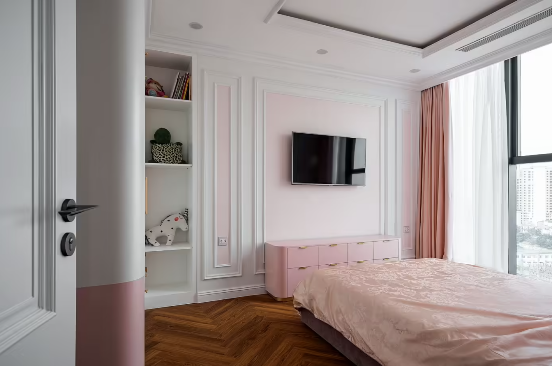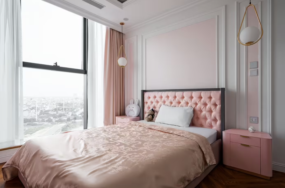 Còn phòng ngủ của con gái trẻ trung, thanh lịch và không kém phần mộng mơ, màu hồng, đặc biệt là hồng pastel. Bảng màu này làm nền hoàn hảo cho các chi tiết trang trí, tạo cảm giác không hề lạnh lẽo.