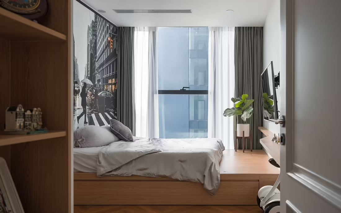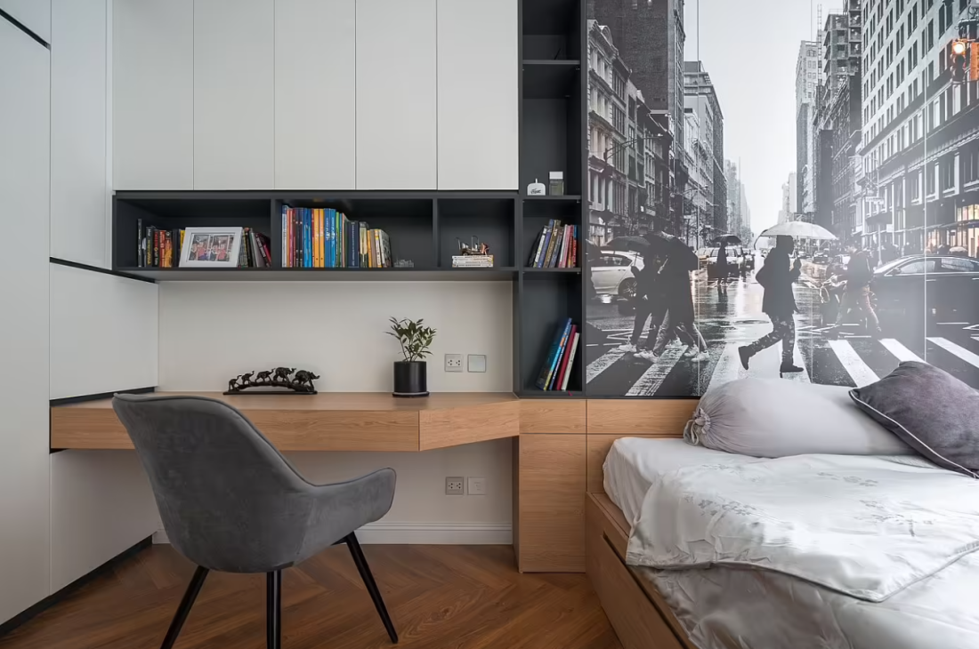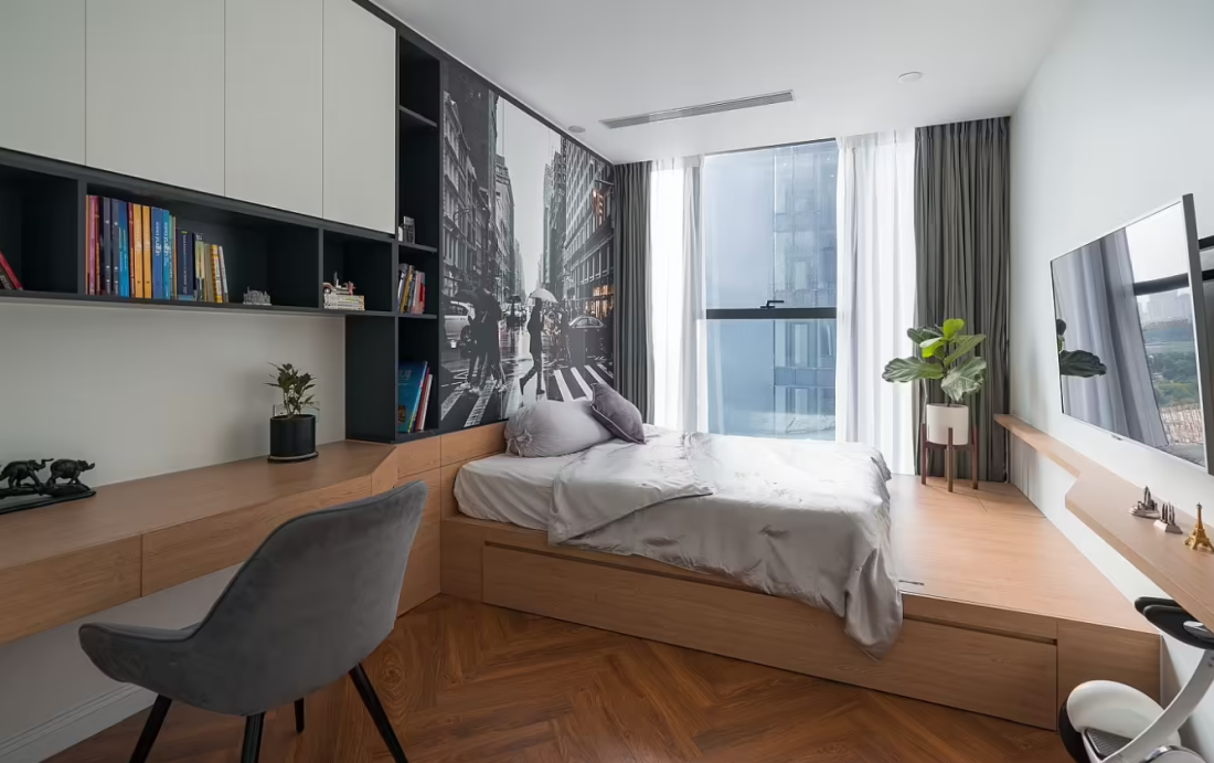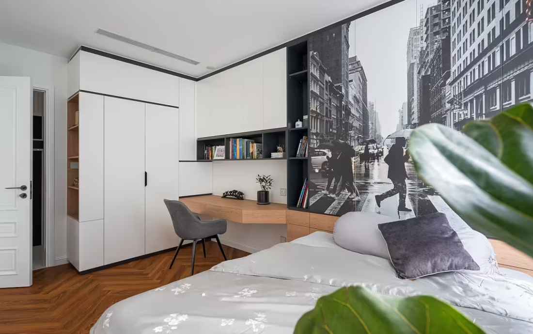 Sàn ốp gỗ xương cá. vừa là không gian nghỉ ngơi vừa là nơi học tập, phòng ngủ mang mang nguồn năng lượng tương hỗ.