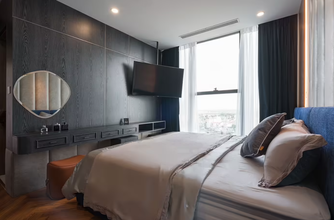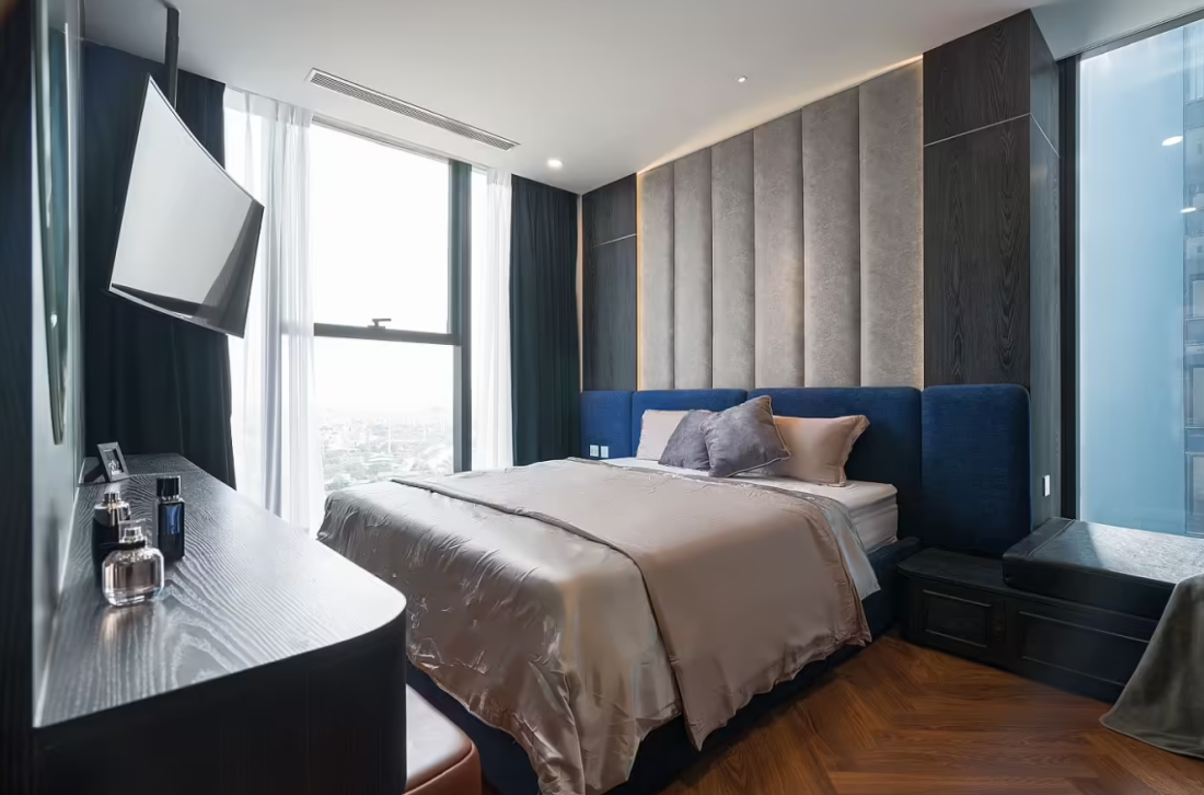 Trong khi đó phòng ngủ Master với vẻ hoài cổ và sự nghiêm ngặt về công năng kết hợp cùng bản màu trầm chủ đạo là xám, đen.