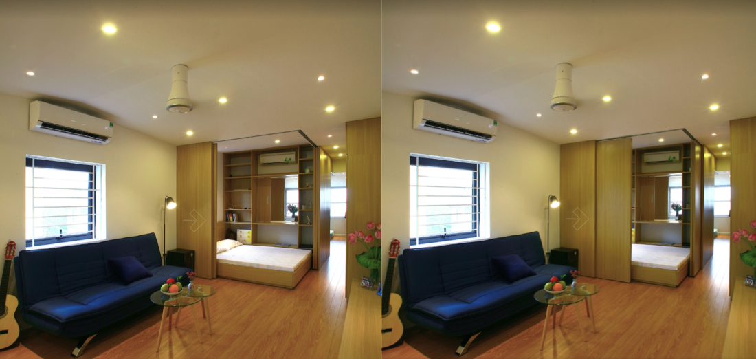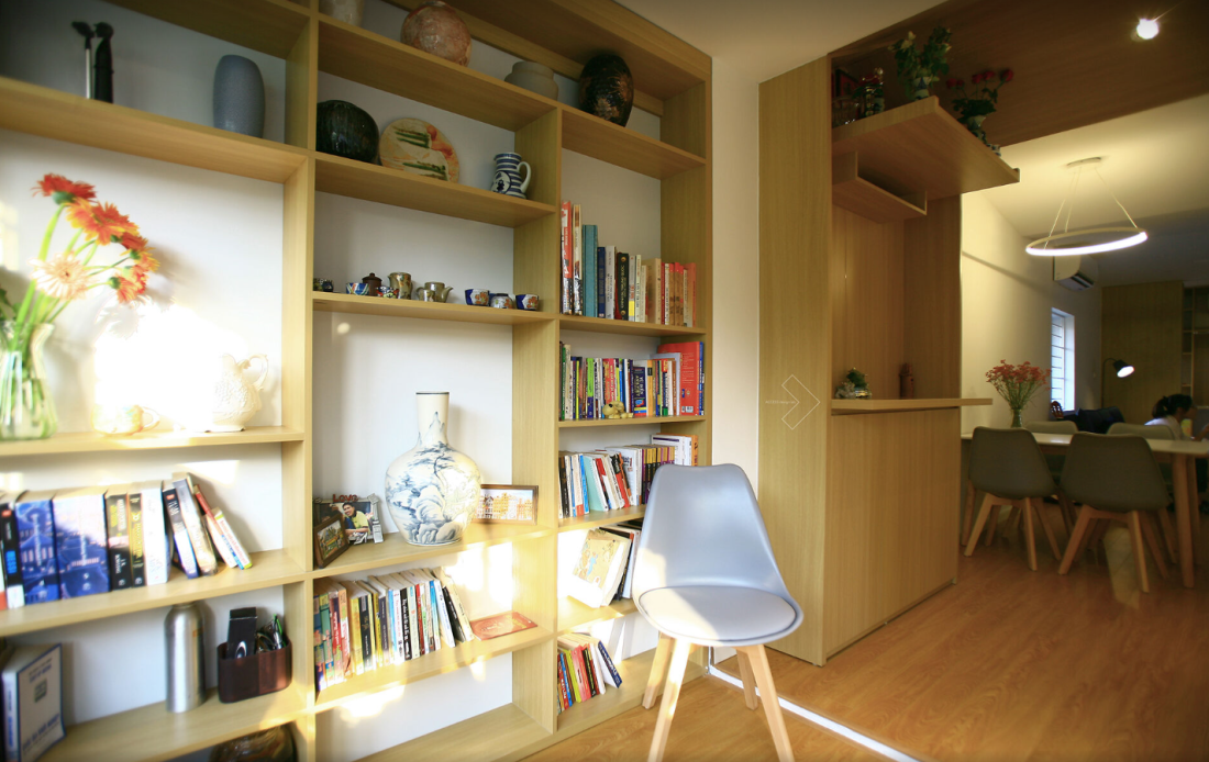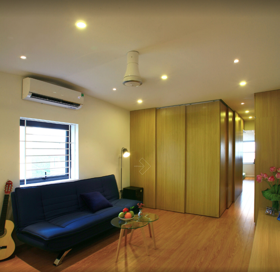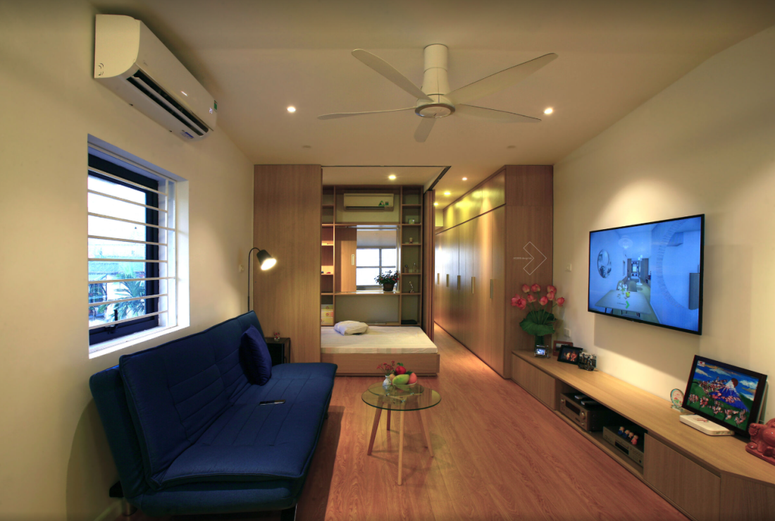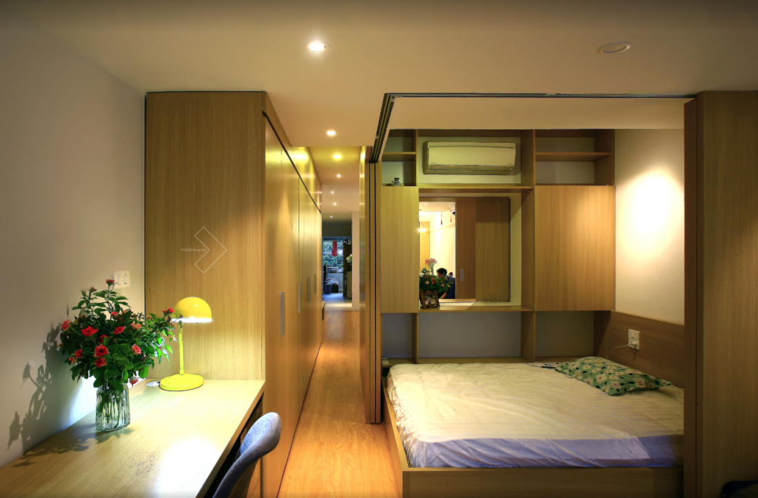 Phòng ngủ thông minh: Cả ba phòng ngủ đều cạnh nhau được thiết kế tối giản nhưng hiệu quả. Trong đó hai phòng ngủ như chiếc hộp ngăn cách bởi vách kệ gỗ. Phóng ngủ thứ 3 tích hợp ngăn kéo và tủ sách bên dưới. Tủ quần áo âm tường giúp giải phóng không gian sàn.