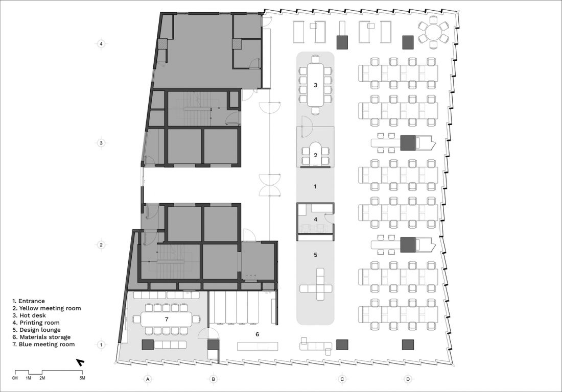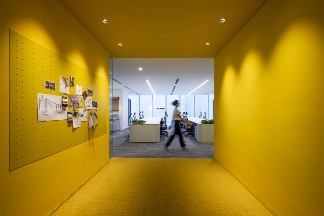 Thay vào đó các khối màu, hình dạng hình học nhìn xuyên thấu được sử dụng tại một số không gian có tác dụng vừa phân chia không gian vừa phá vỡ giới hạn tầm nhìn. Cách này phù hợp với phong cách làm việc theo triết lý của công ty là khuyến khích mọi người tương tác và trao đổi liên tục trong công việc.