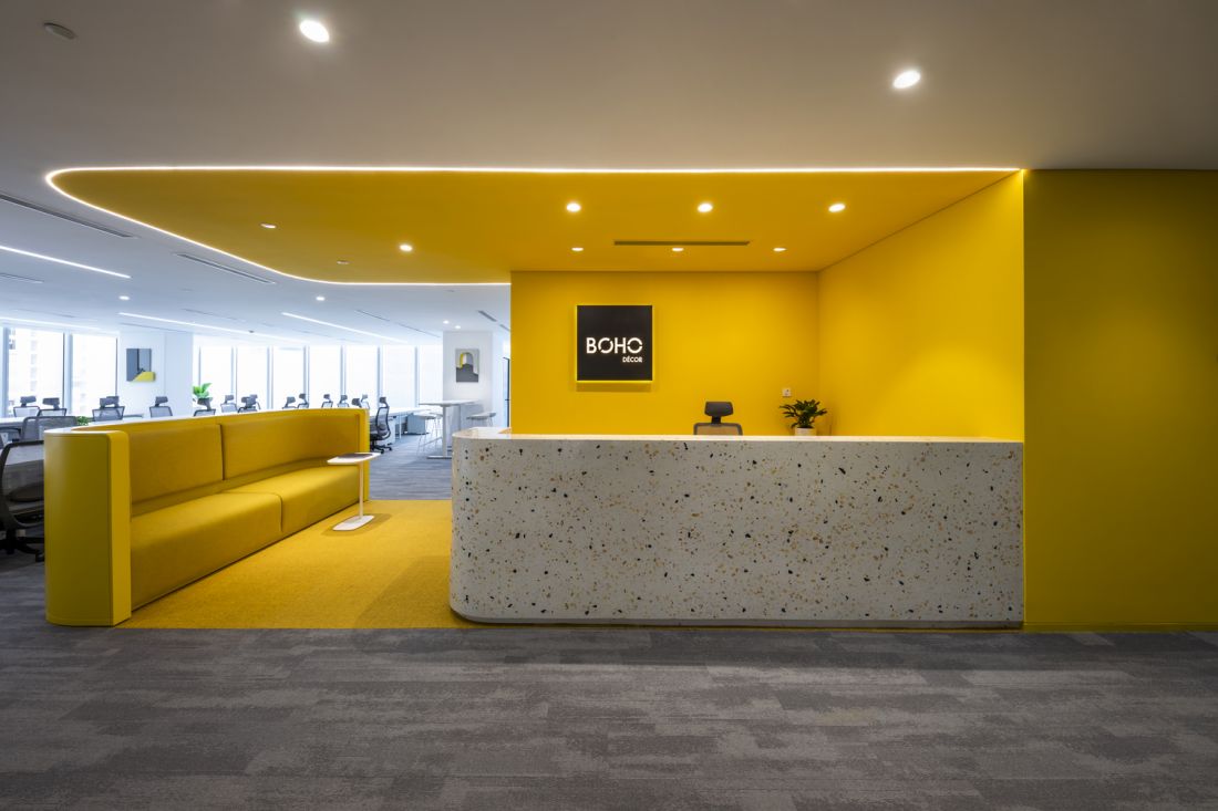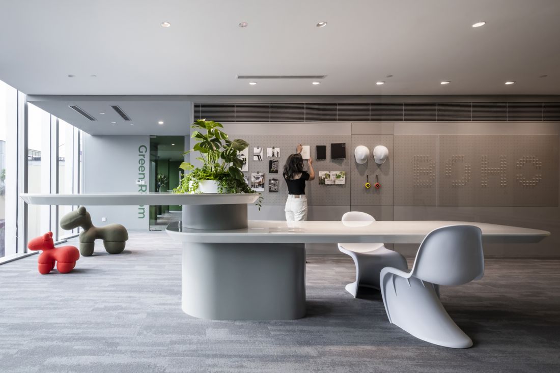 Bên cạnh thông điệp hướng đến tươi sáng và gọn gàng thì kiến trúc sư cũng quan tâm đến việc làm thế nào để văn phòng như ngôi nhà thứ hai thật thoải mái, thư giãn tinh thần, vì vậy các đường cong được thiết kế nhằm làm dịu các chi tiết cứng cáp, cây xanh được đặt khắp văn phòng và tại bàn làm việc.