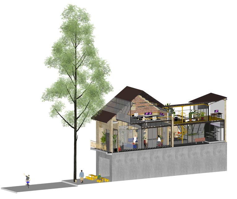 Phối cảnh tầng trên của ngôi nhà dùng làm văn phòng