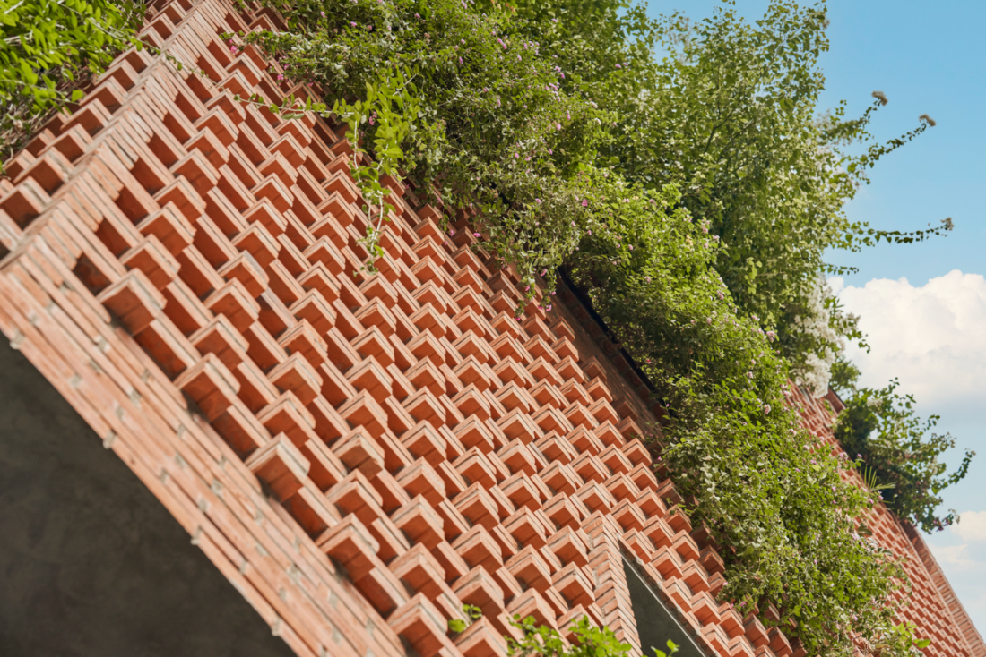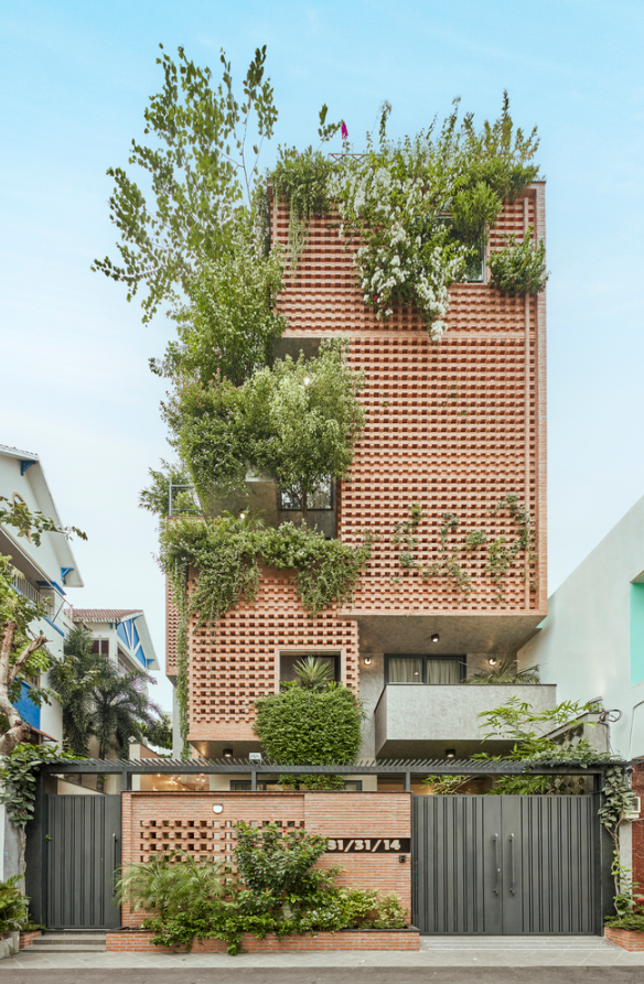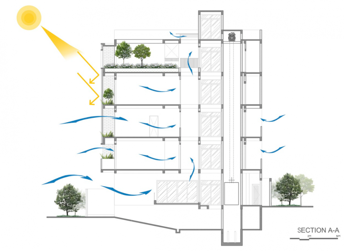 Sau khi khảo sát và tìm hiểu, kiến trúc sư đã đưa ra một số giải pháp như sử dụng cửa kính trượt có kích thước khác nhau và mỗi tầng đều thiết kế khu vườn nhỏ giúp ngôi nhà được bao quanh thảm thực vật, để đảm bảo ngôi nhà luôn mát mẻ. Bên ngoài, mặt tiền của ngôi nhà 5 tầng được ốp 25.000 viên gạch sole với vô số lỗ trống có tác dụng cản gió cũng như ánh nắng gay gắt chiếu vào bên trong.