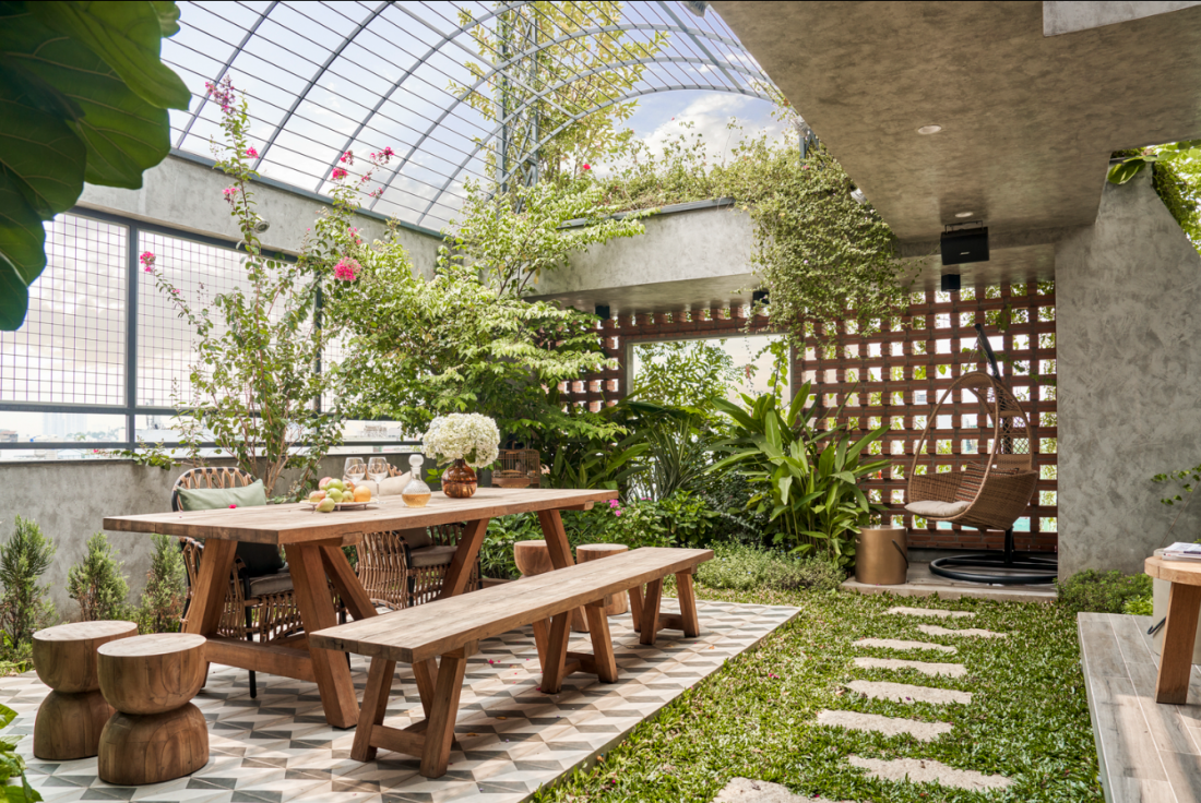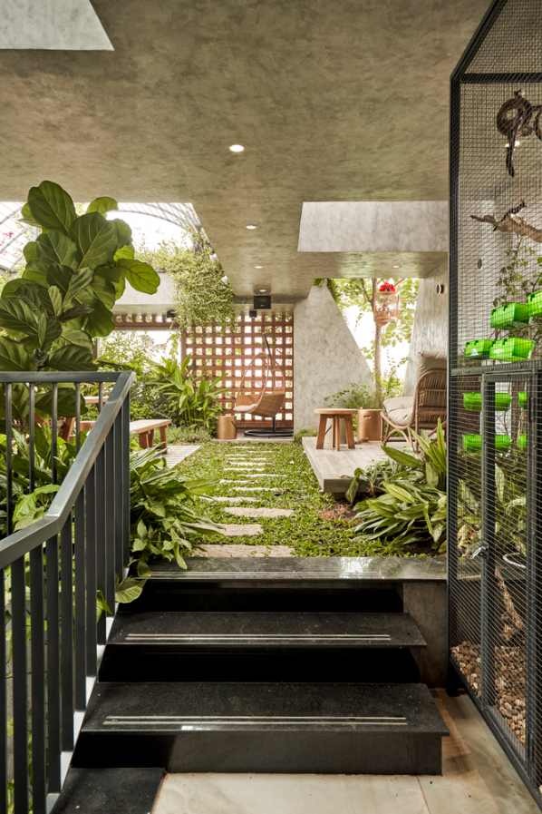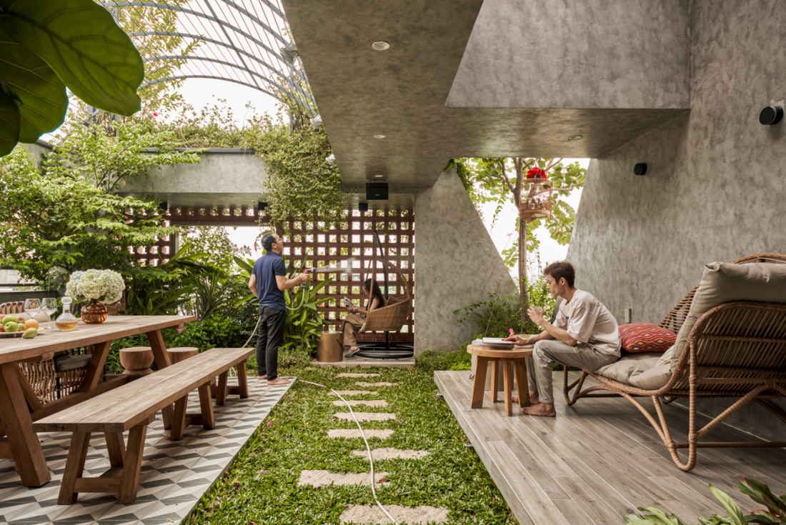 Sân hiên bao gồm không gian tiếp khách, nơi mọi người thư giãn và ngồi nhâm nhi tách trà, cạnh bên là khu vực trồng cây xanh với hệ thống tưới tự động, bên trên là mái vòm lưới tạo sự thoáng mát.