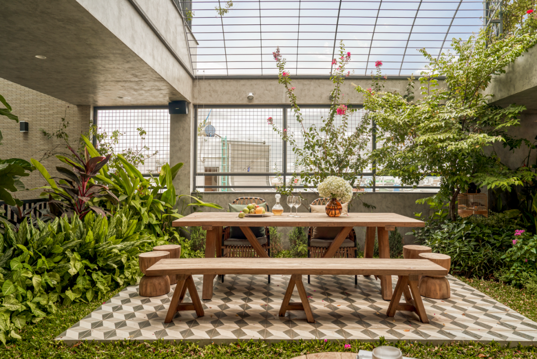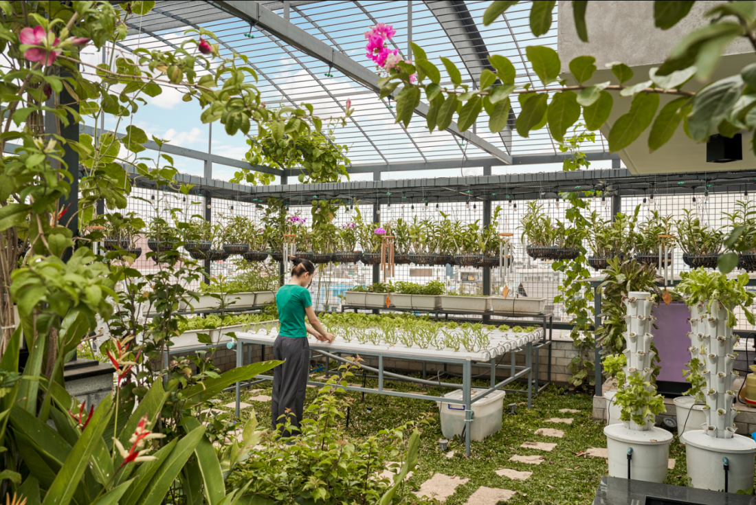 Tầng 5, diện tích phần lớn dành cho không gian sân thượng – nơi đây thường tập trung lượng bức xạ nhiệt cao nhất của ngôi nhà và cũng thường bị bỏ qua khi xây nhà. Chính vì vậy, để xóa tan cảm giác trên, sau khi hoàn thiện khu vực này đã trở thành một khu vườn nhiệt đới có cả khu vực trồng rau dành cho gia đình.