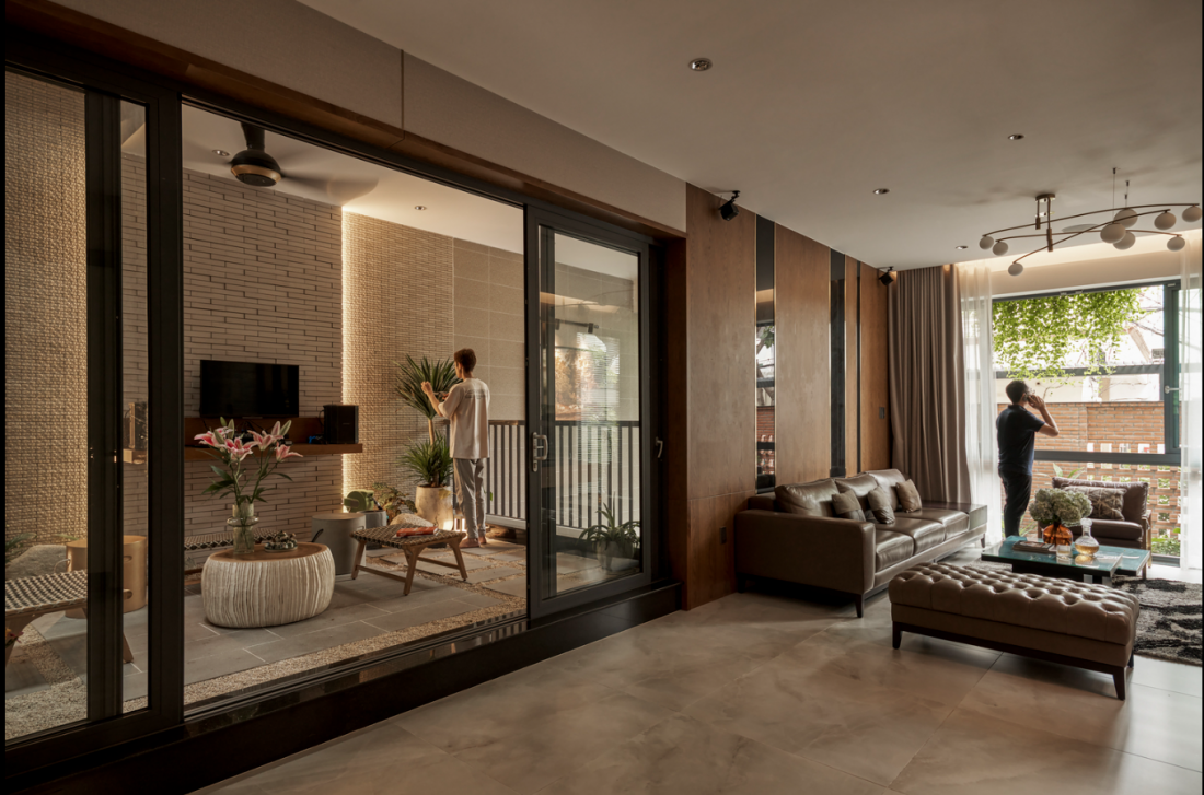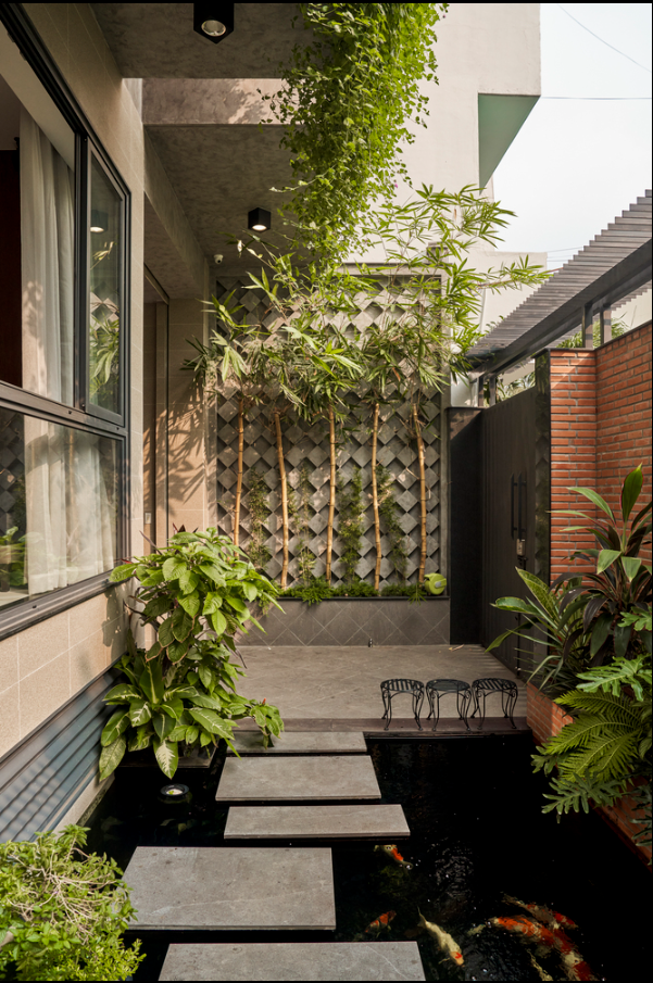 Ngoài ra để cải thiện tình trạng bụi, nhiệt độ tăng kèm theo những cơn gió nóng thổi vào bên trong, kiến trúc sư còn thiết kế hồ cá đặt phía trước nhà, xung quanh là cây xanh. Giải pháp này giúp gia chủ hay các thành viên có thể quan sát hồ cá và cây xanh bên ngoài phòng khách – một cách để hòa mình thư giãn giữa thiên nhiên.