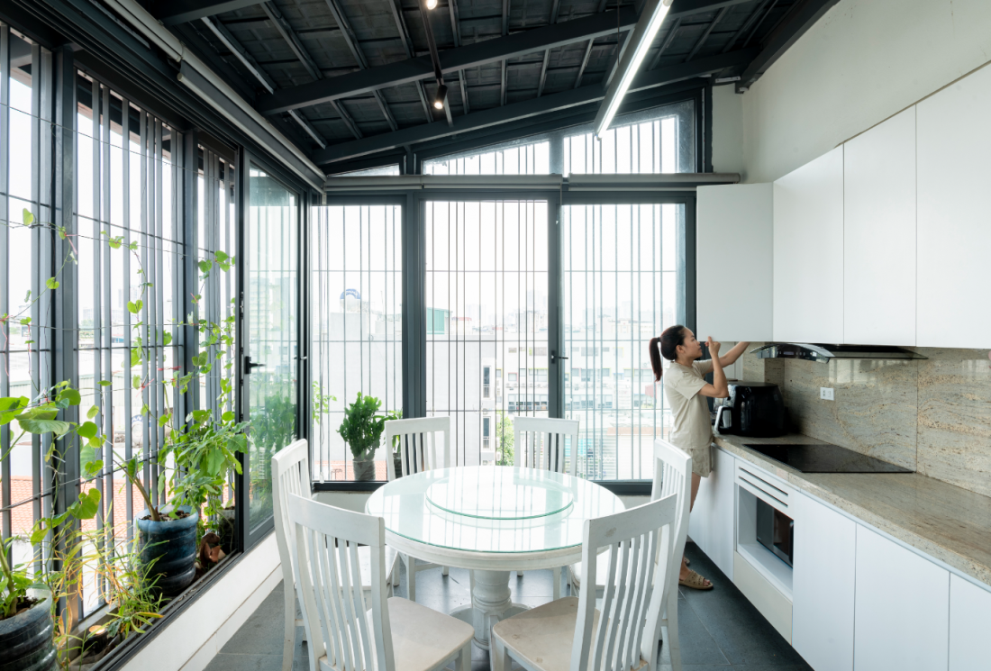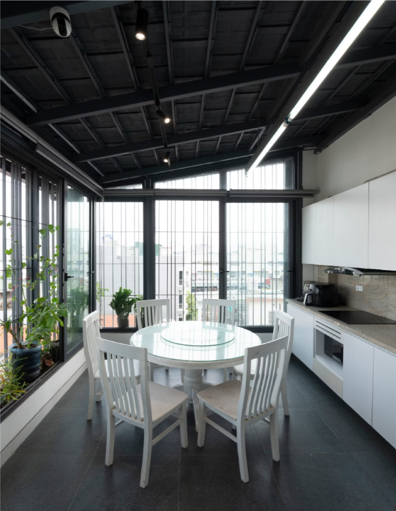 Mặc dù gian bếp khá khiêm tốn tại tầng trên cùng nhưng phần mái đen có phần tương phản với hệ tủ bếp và bàn ăn màu trắng; sự đối lập này tạo cảm giác vừa mạnh mẽ vừa trầm tĩnh.