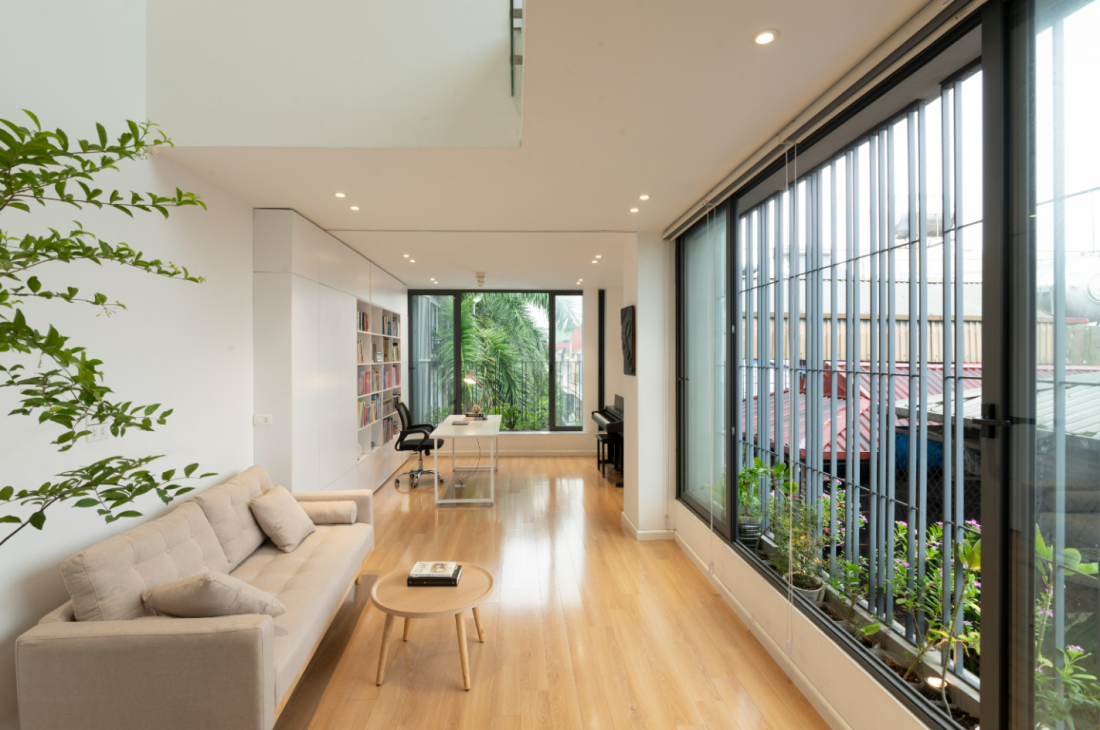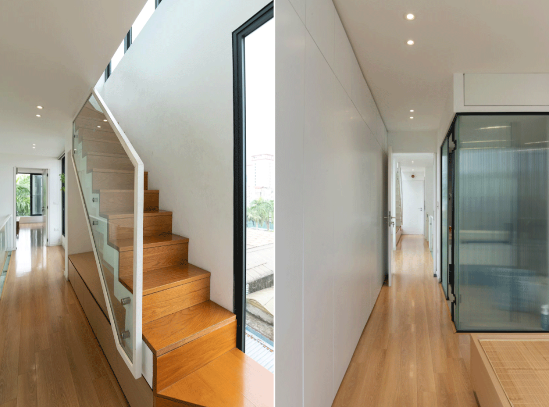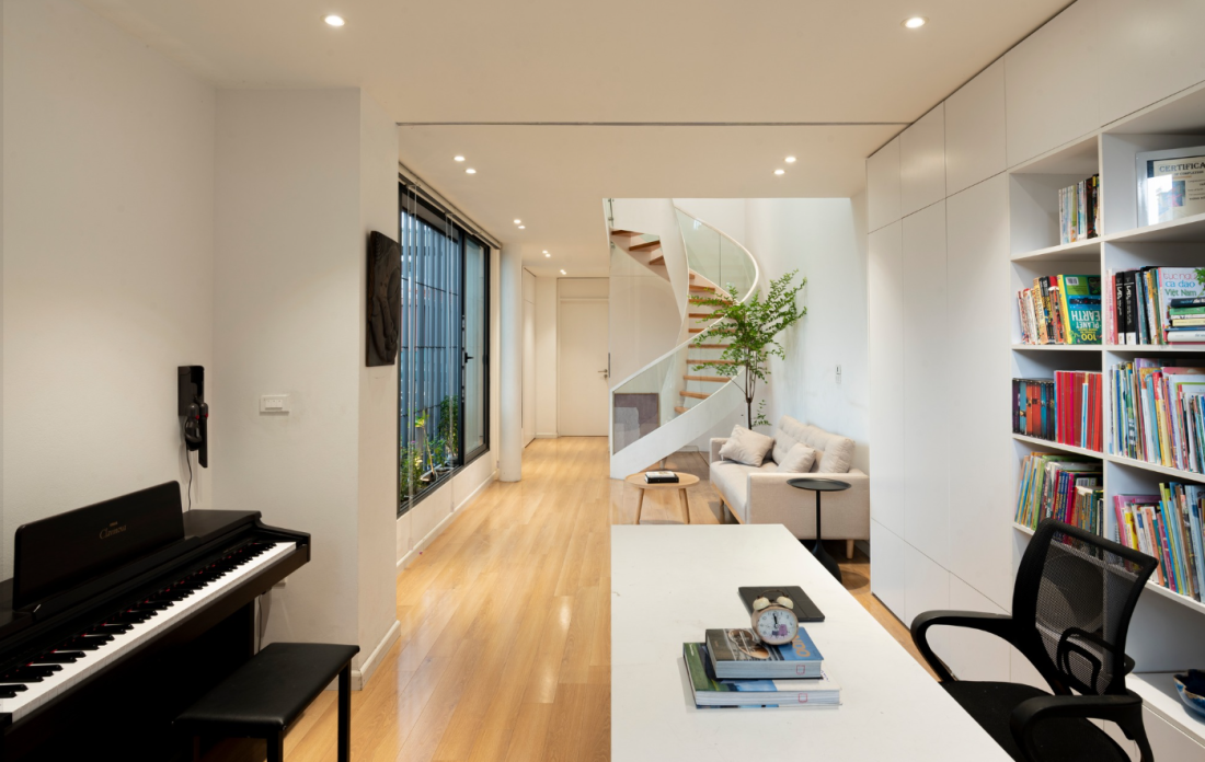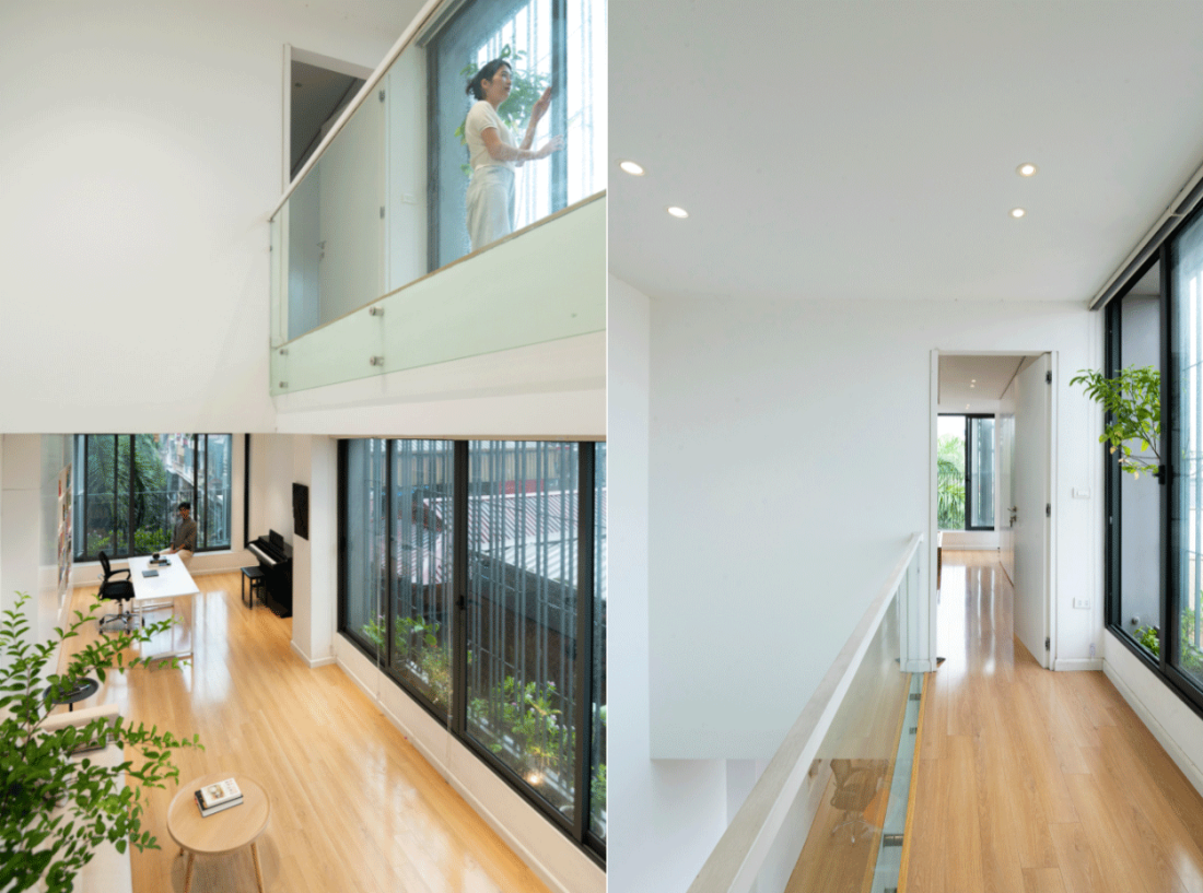 Khoảng rỗng đôi: Một khoảng rỗng cao gấp đôi được đặt giữa tầng 4 và tầng 5. Chi tiết kiến trúc này không chỉ tăng cường sự liên tục về thị giác mà còn là trung tâm kết nối, nơi các thành viên gia đình có thể tương tác dễ dàng, xóa tan cảm giác ngăn cách giữa các tầng.