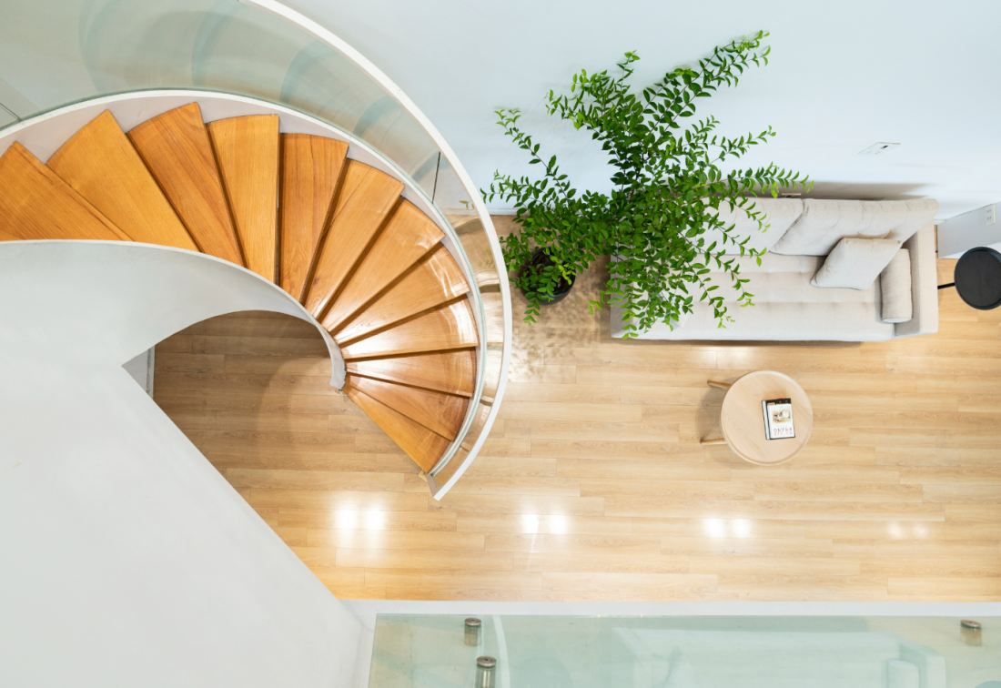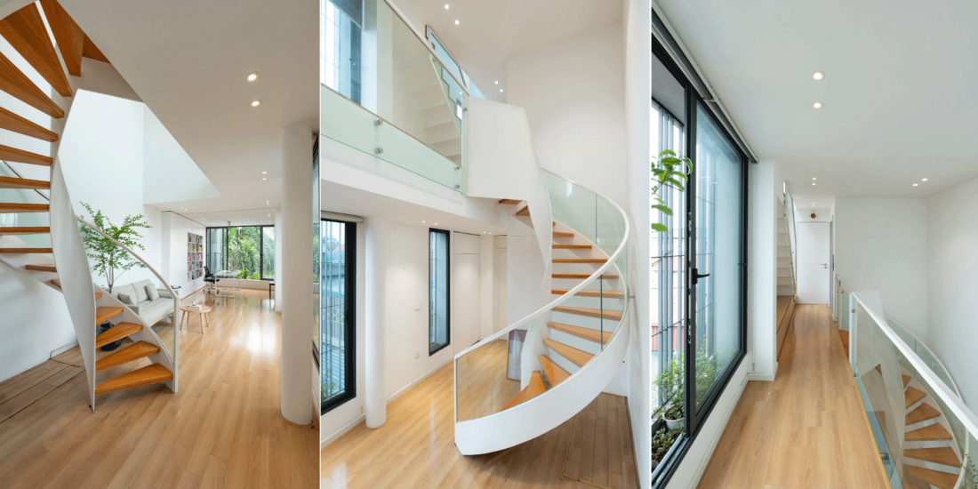 Cầu thang xoắn ốc trở thành tâm điểm chú ý nhiều hơn tại khu vực phòng khách.