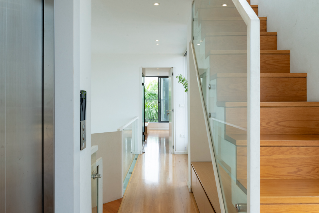 Ngoài cầu thang bộ, ngôi nhà có bố trí thang máy đáp ứng nhu cầu tiện lợi cho các thành viên. Khoảng hành lang dẫn đến phòng ngủ đều được thiết kế sáng tạo, đa năng.